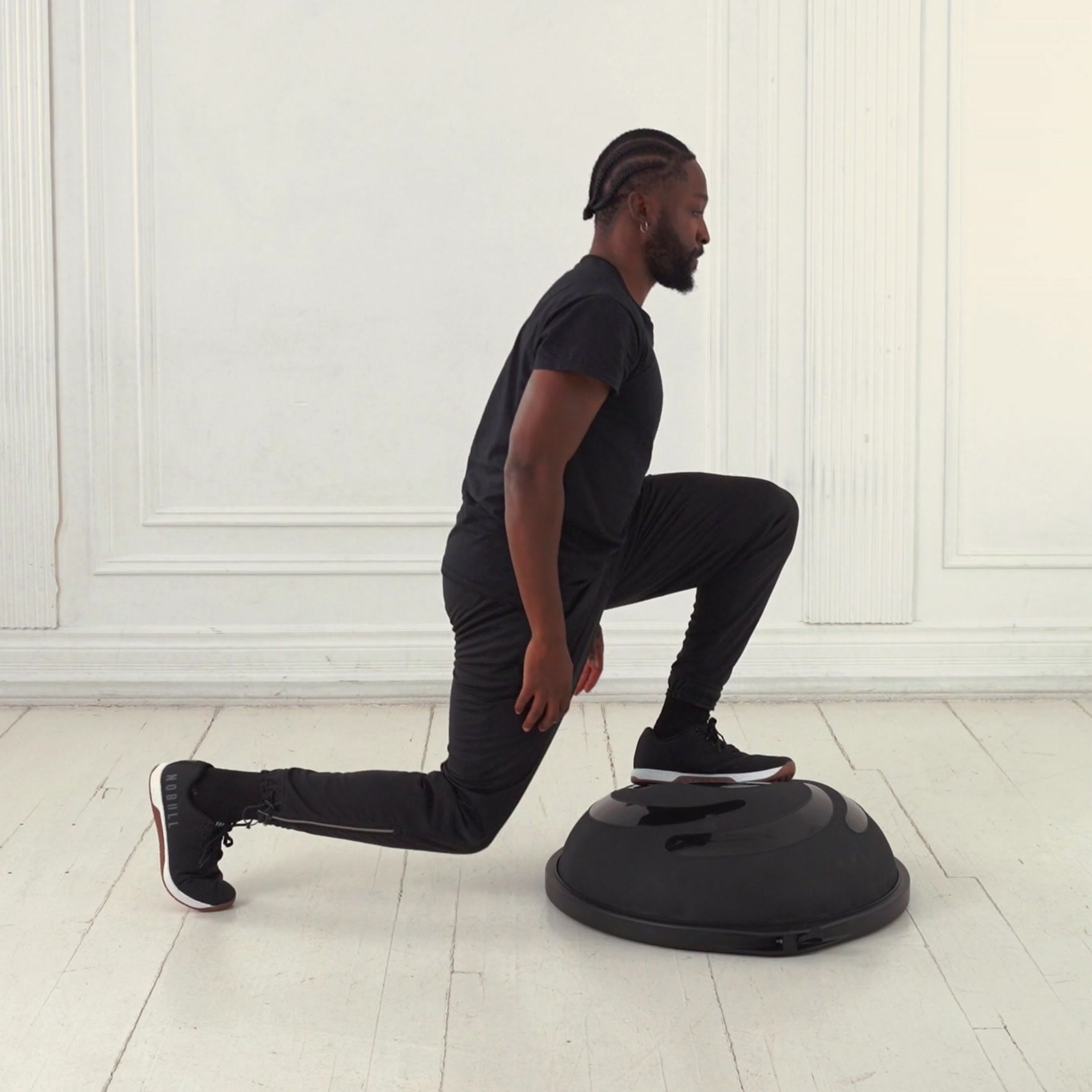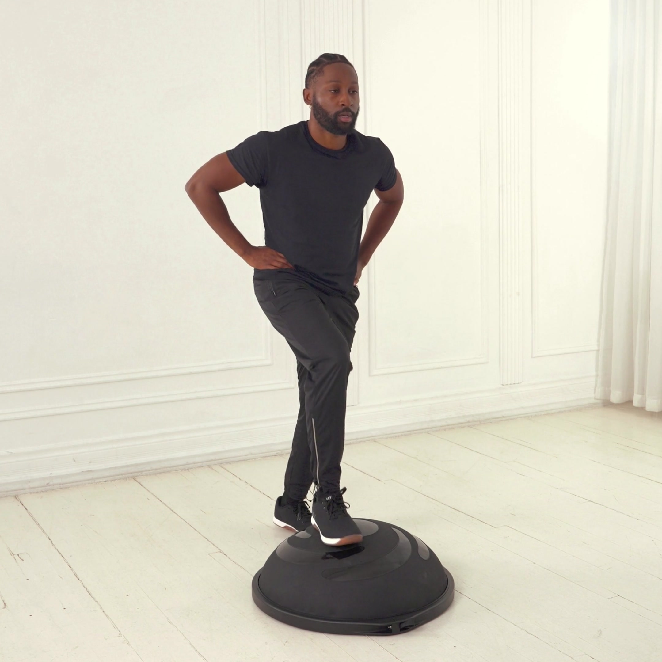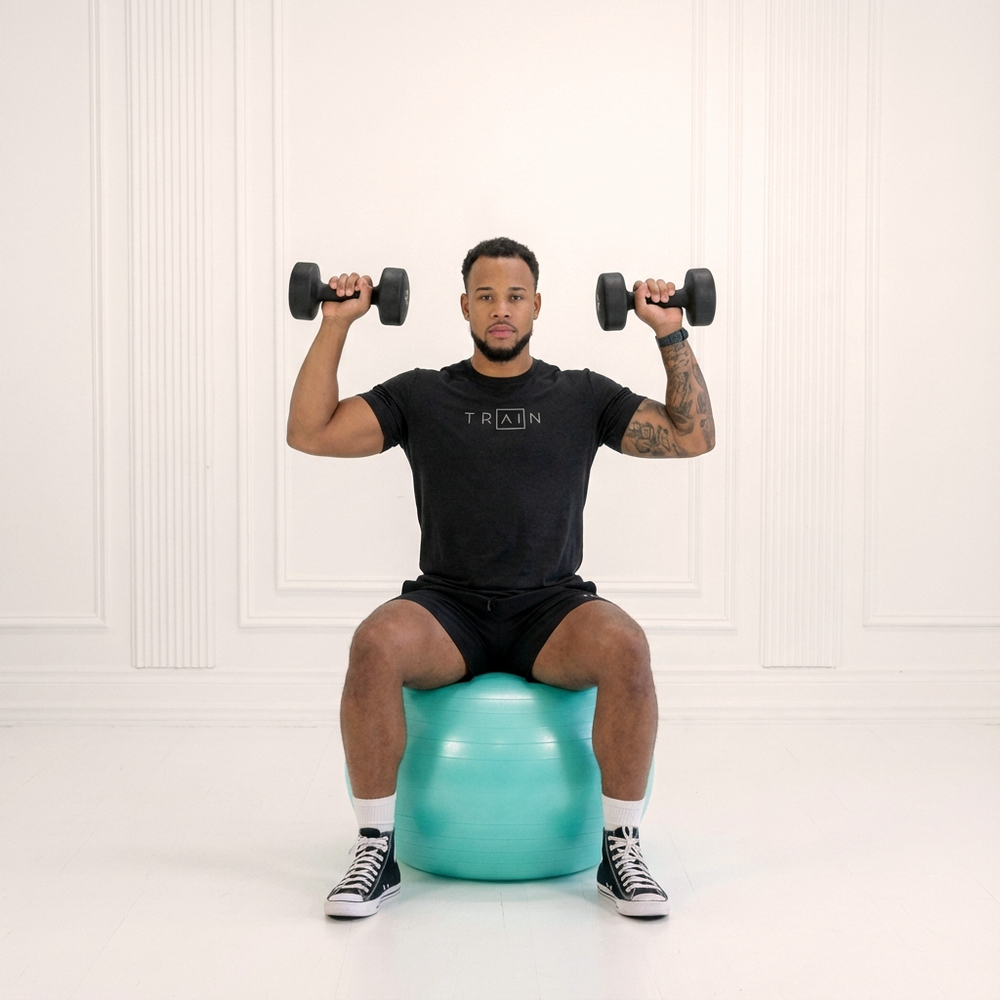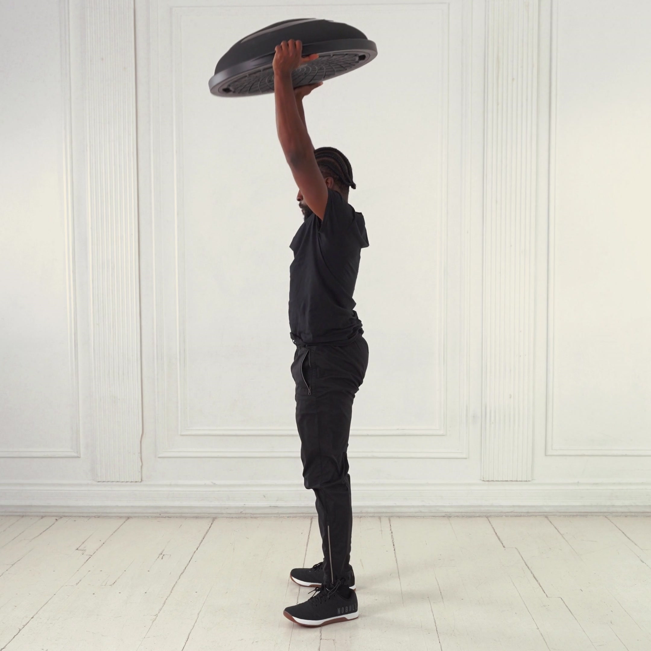 Place balance trainer dome side up on a stable surface. Step onto it with hip-width feet, then press stability ball overhead with straight arms.