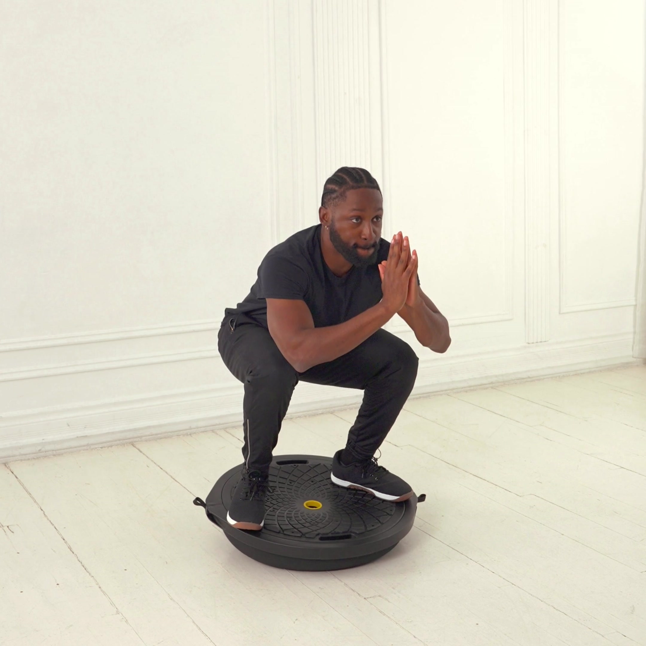 An unstable squat variation using a balance trainer and overhead stability ball that targets quads, glutes, and core to build strength, balance, and coordination; ideal for advanced stability training.