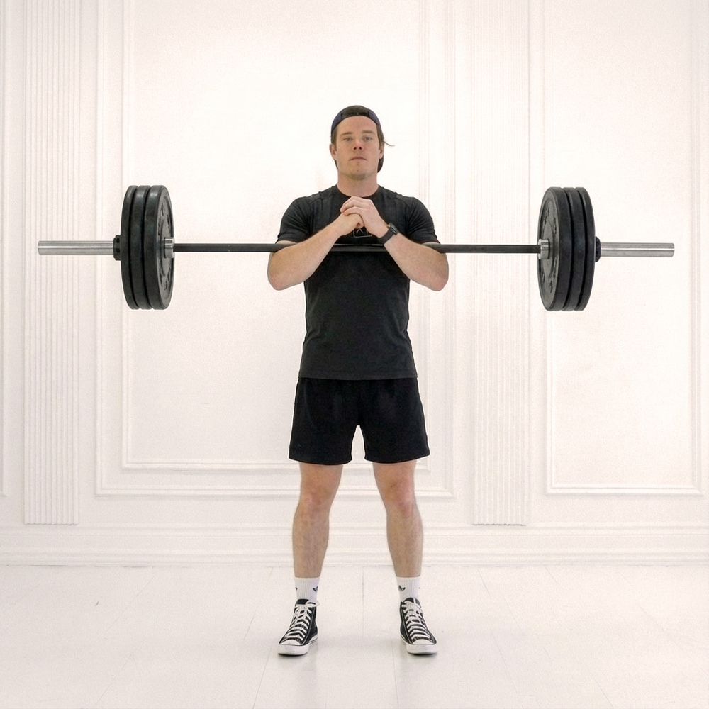 Kneel on a mat with a loaded barbell in front of you, gripping it overhand at shoulder width with shoulders over the bar and core braced.