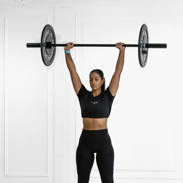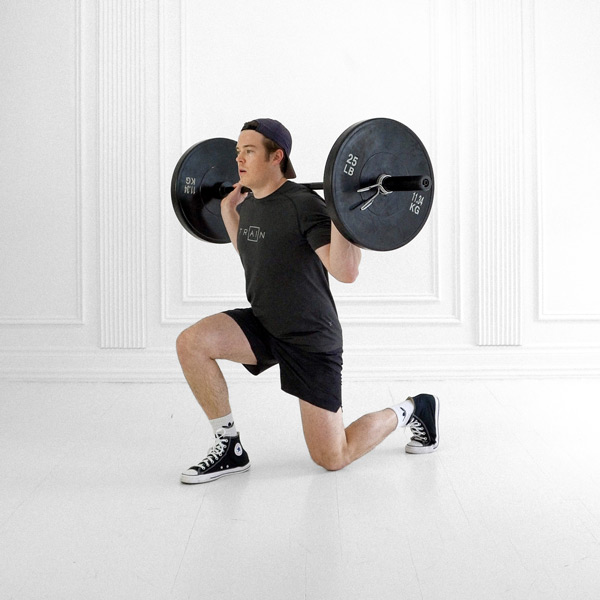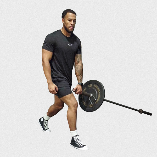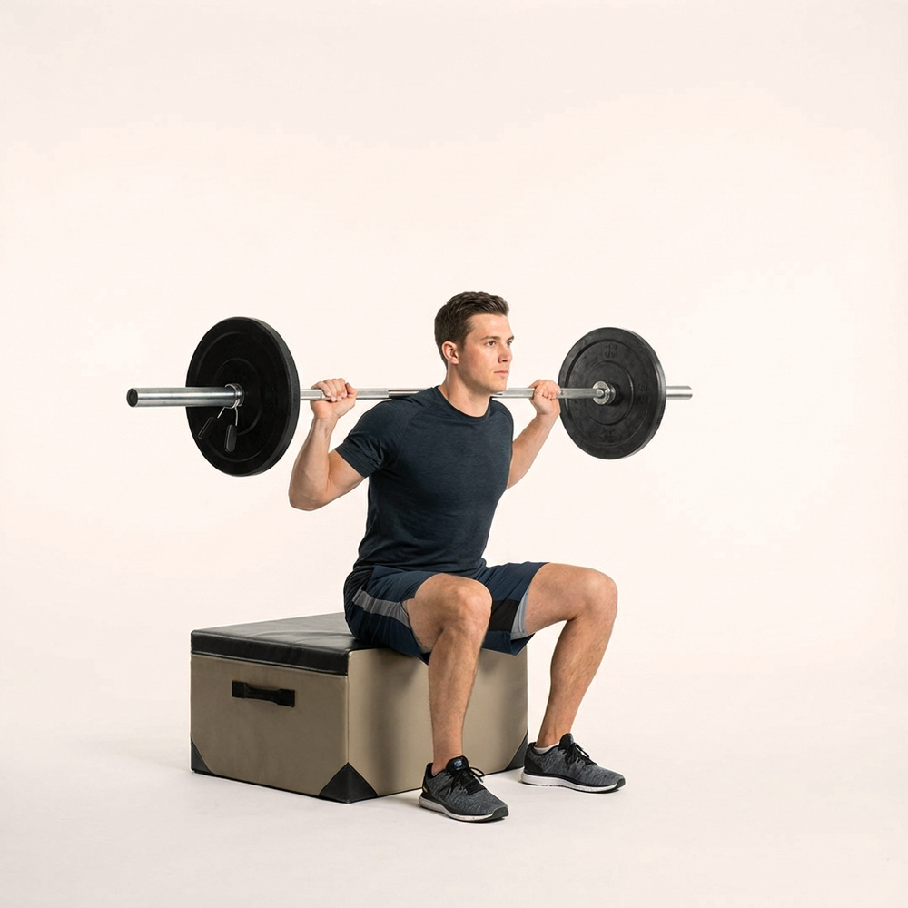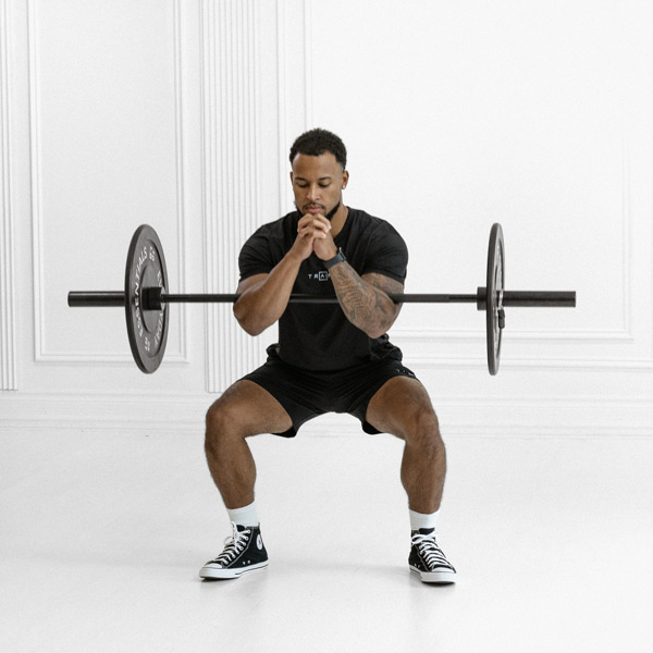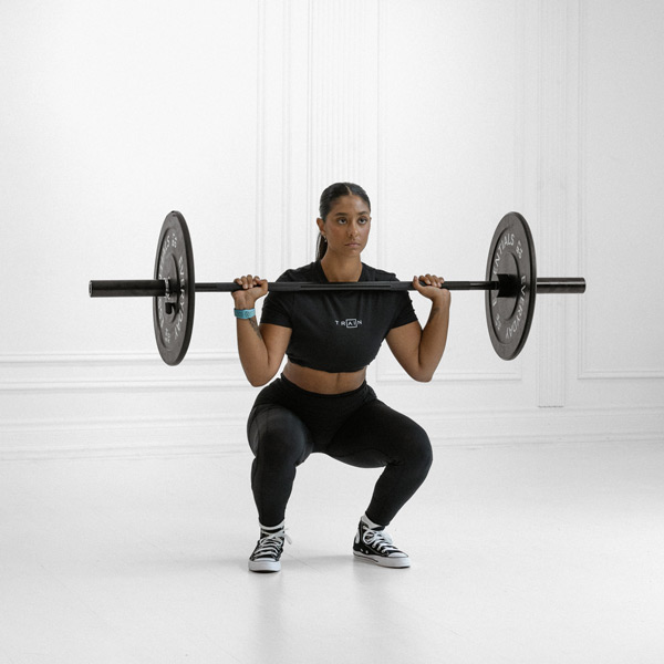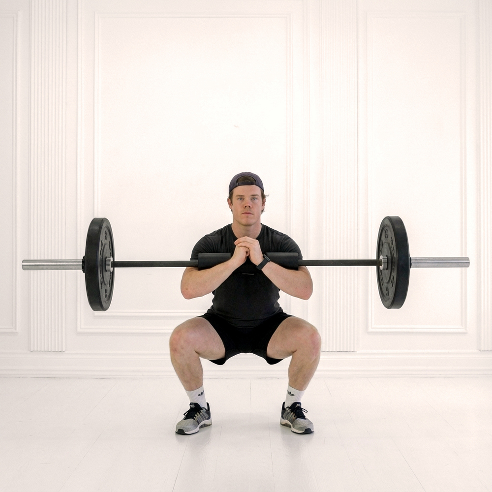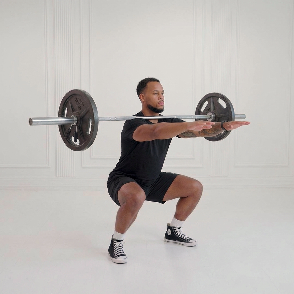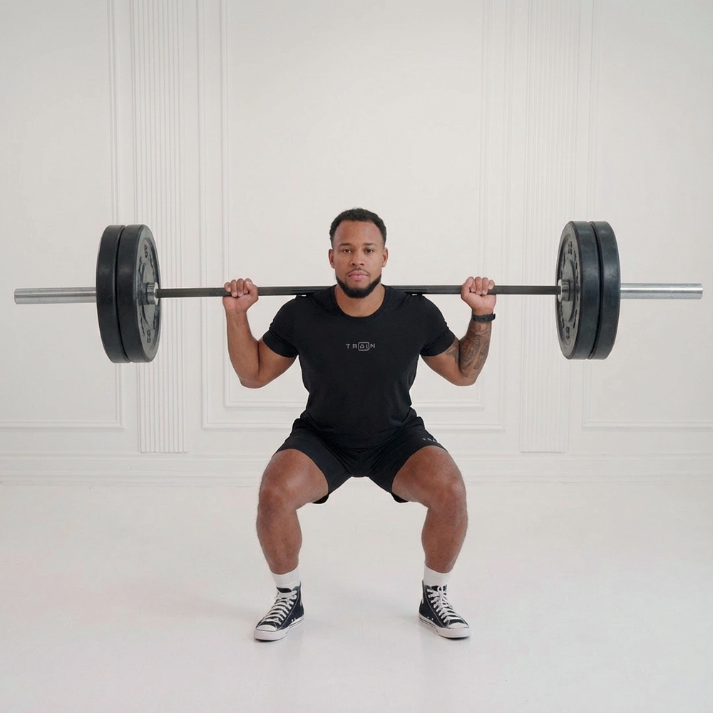 Barbell-loaded squat that targets quads, glutes, and hamstrings to build lower body strength and power; a foundational compound exercise for overall athletic performance.