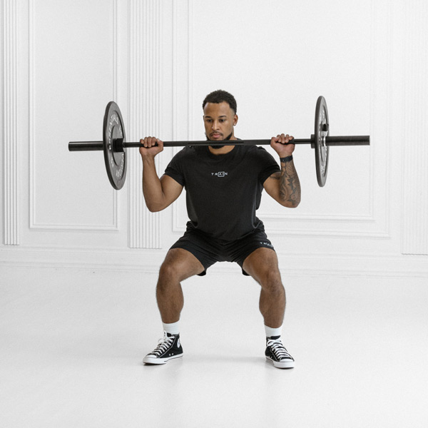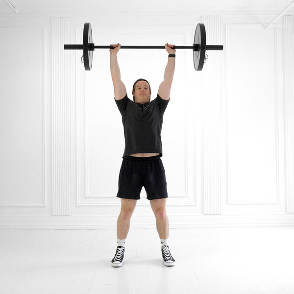 Bar starts on floor touching mid-foot; pull to maximum height near chest; catch in full squat below parallel, then stand to full extension.