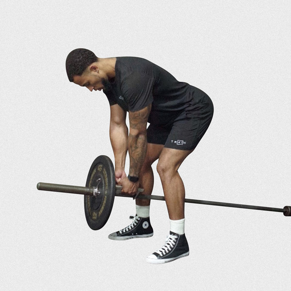 Anchor one end of the barbell in a landmine attachment or corner, load the free end with plates, and position a V-grip handle below the plates. Straddle the bar with feet shoulder-width apart, hinge at hips to 30-45 degrees, and grip the handle neutrally with arms extended.