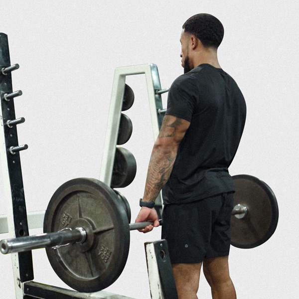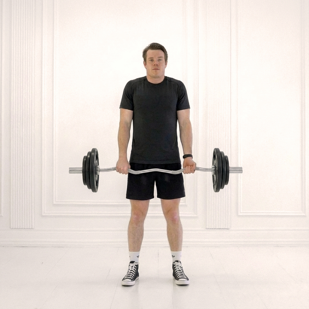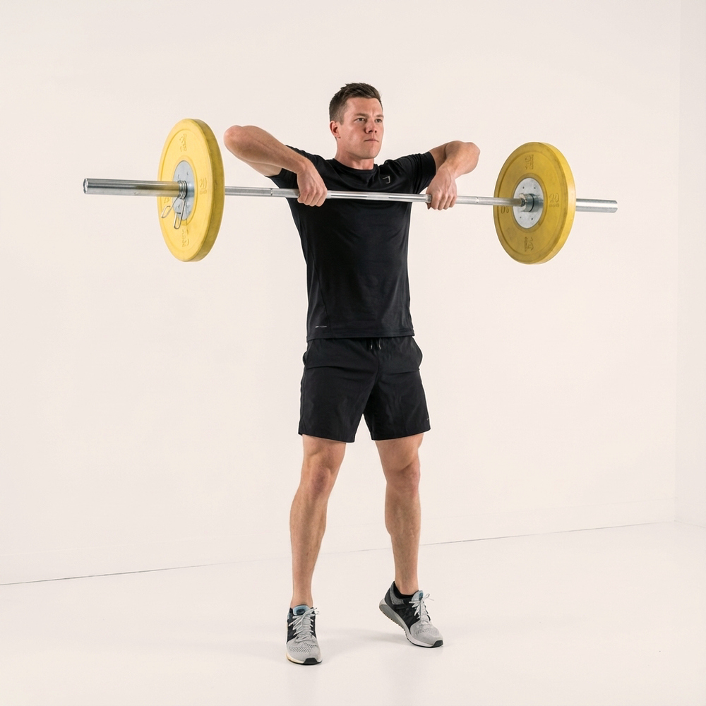 Load a barbell with plates and position it in a squat rack at mid-thigh height. Stand with feet shoulder-width apart, grip the bar overhand slightly wider than shoulders, and unrack it to hang in front of thighs.