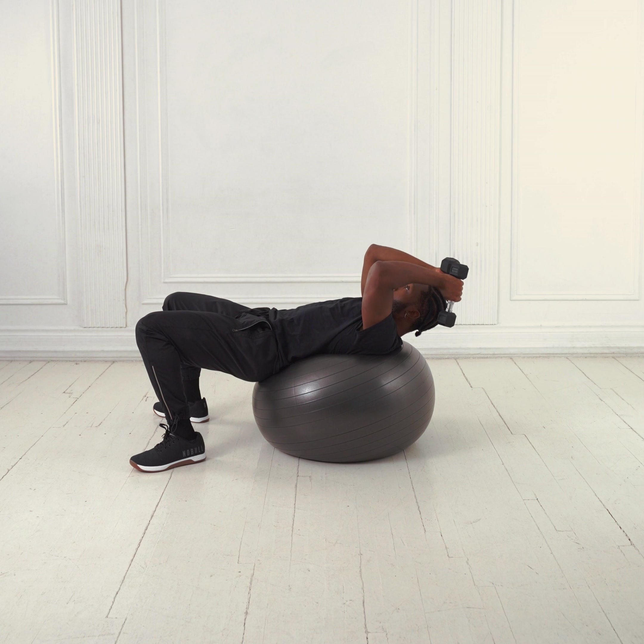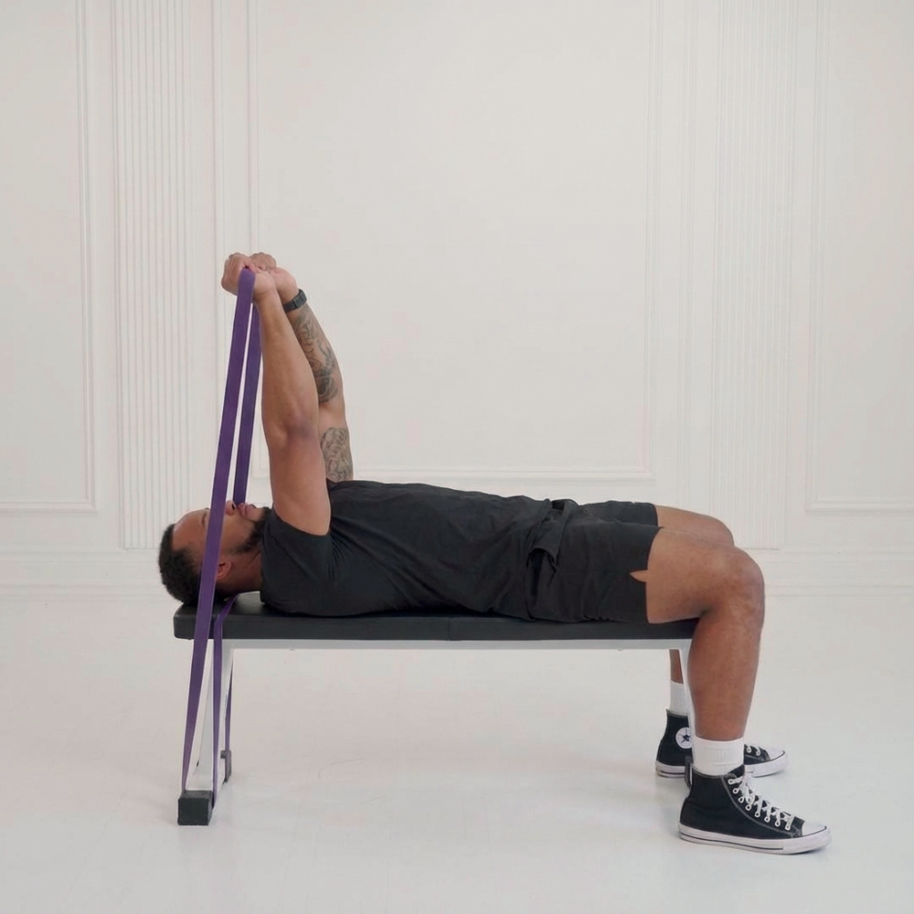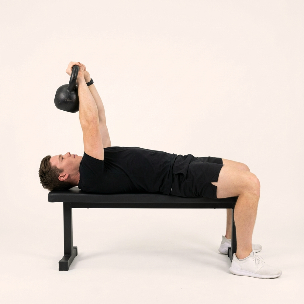 Lie supine on a flat bench with feet planted on the floor. Grasp the barbell with an overhand, shoulder-width grip and extend arms overhead.