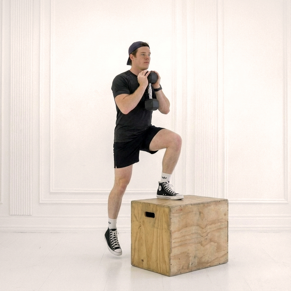Step up until working thigh is parallel to ground or higher if mobility allows; descend until working foot is flat on ground without knee hyperextension.