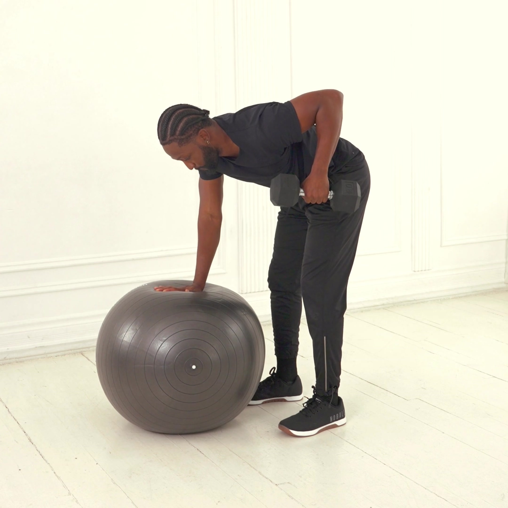 Place one knee and the same-side hand on a flat bench to support your torso. Plant the opposite foot firmly on the floor and hold a dumbbell in the free hand with the arm fully extended.
