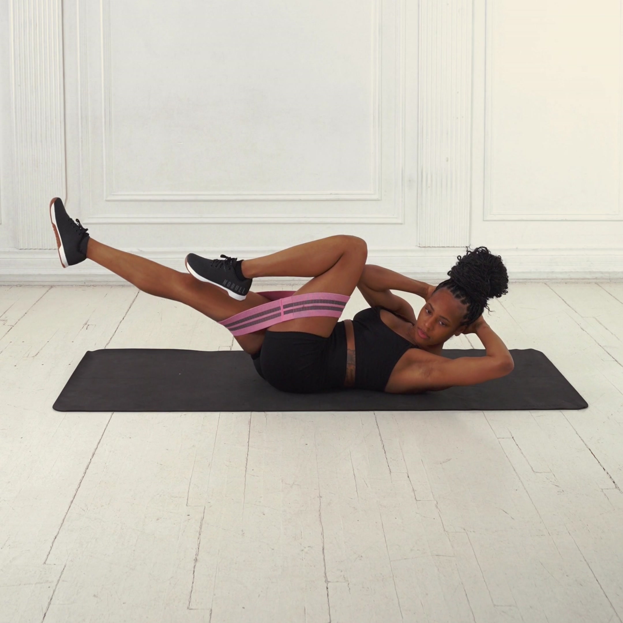 Lift shoulders until elbow nears opposite knee; extend leg to 6-12 inches above floor without touching down.