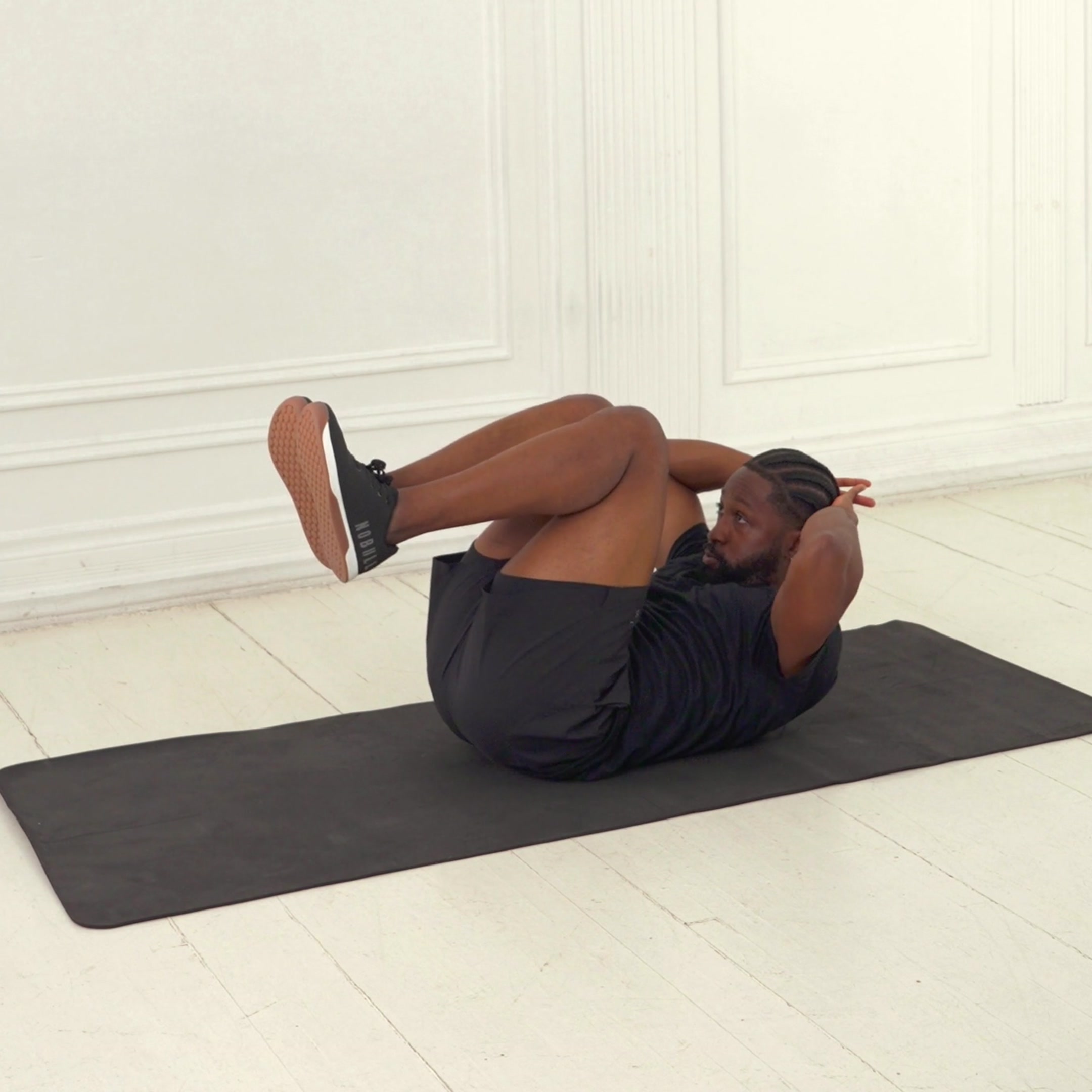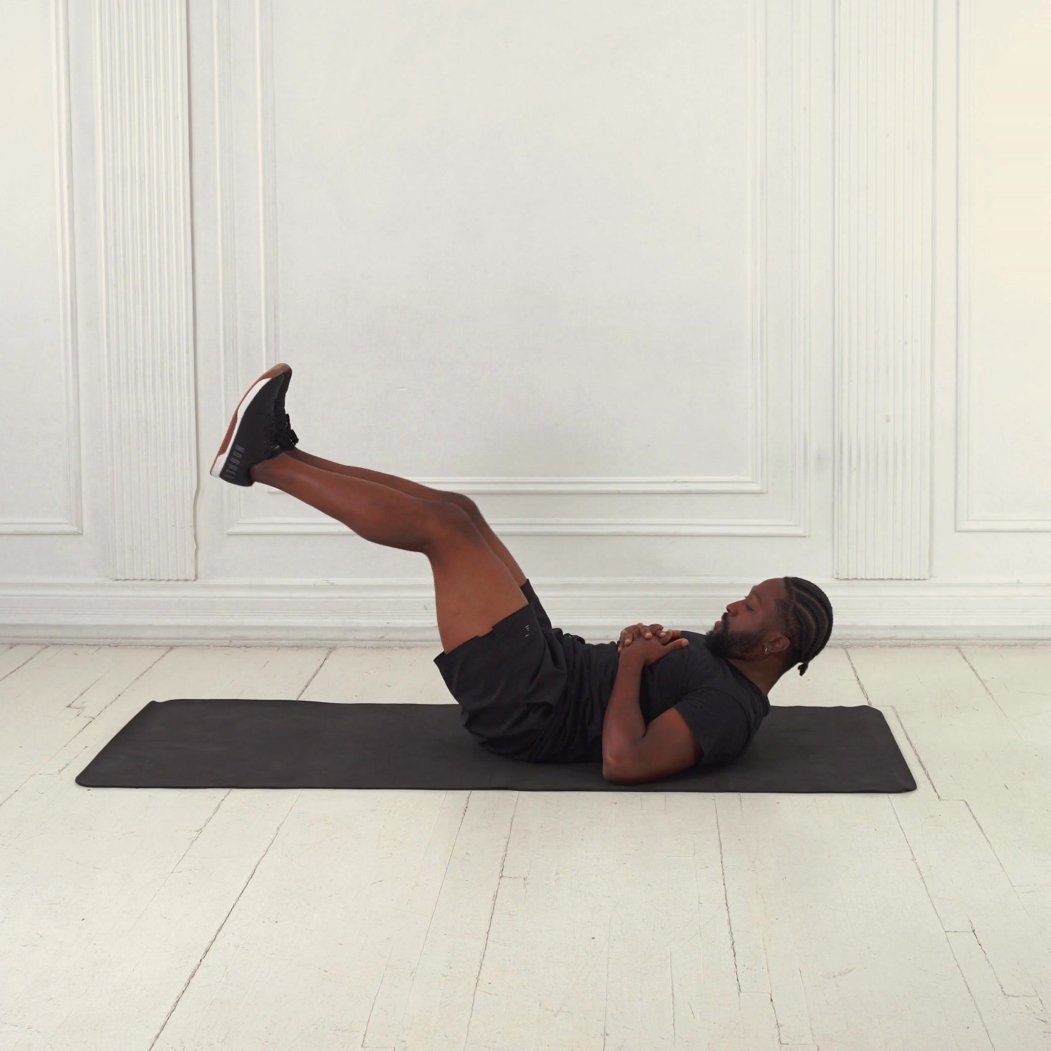 Lie flat on your back on a mat with knees bent and feet flat on the floor. Place hands lightly behind your head with elbows wide.