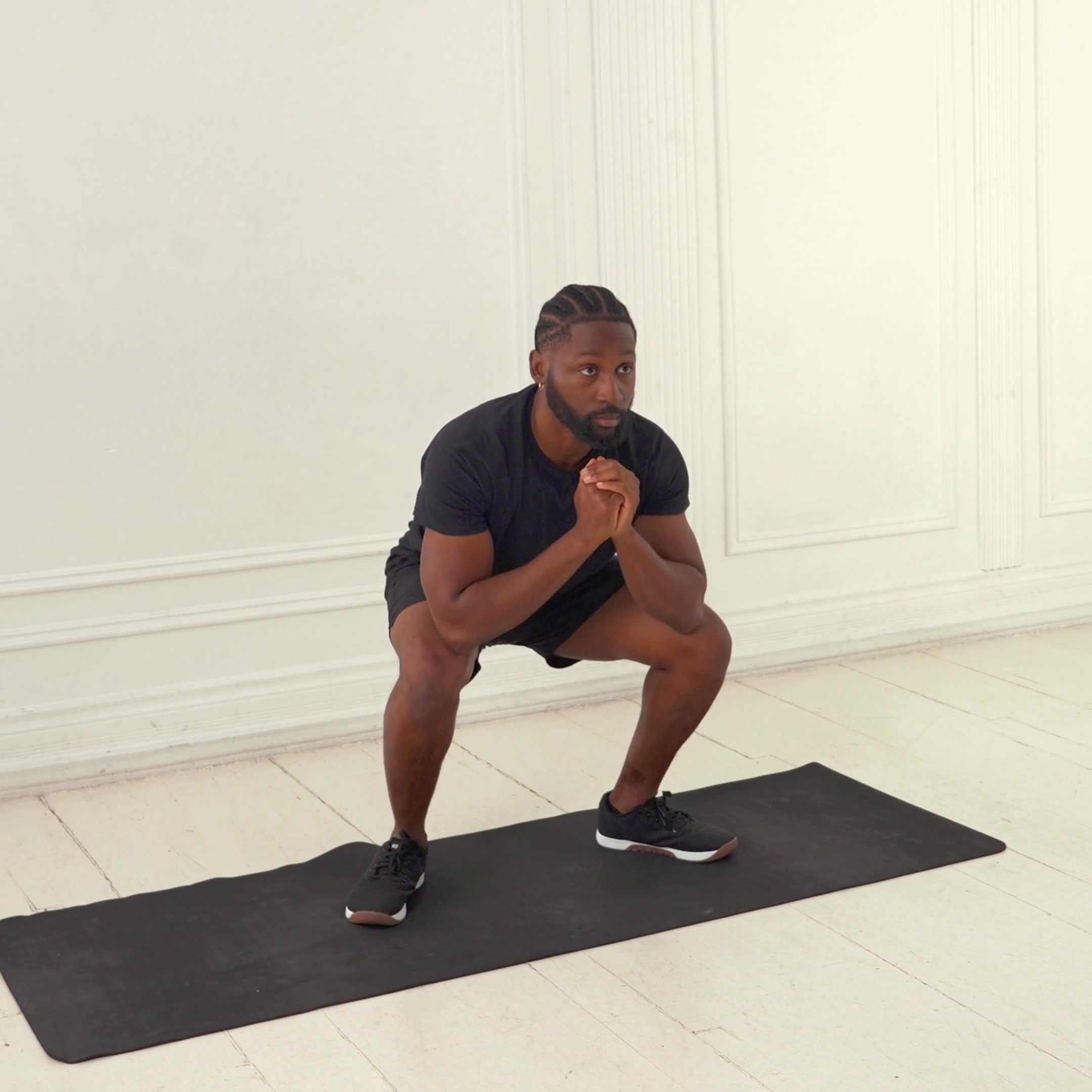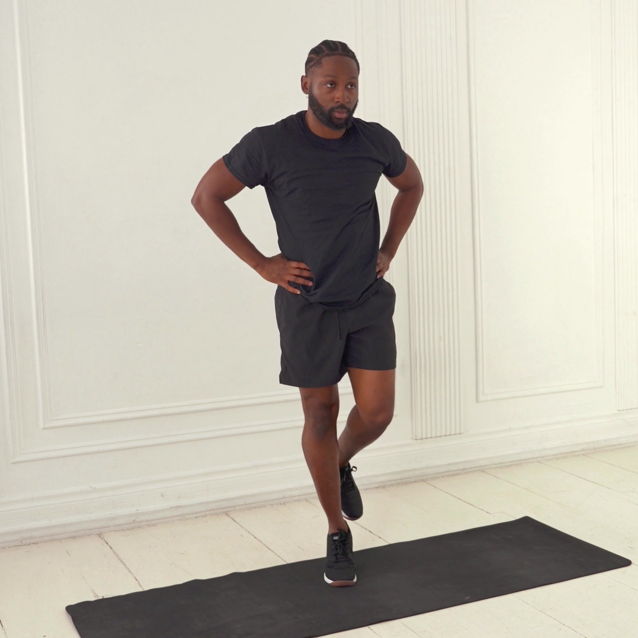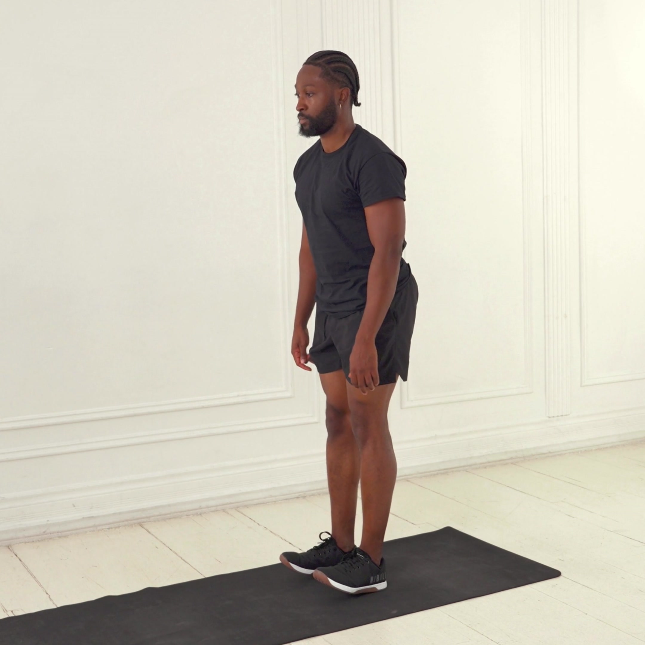 Stand tall with feet shoulder-width apart. Elevate onto the balls of your feet, lifting your heels as high as possible while maintaining a straight, rigid posture.