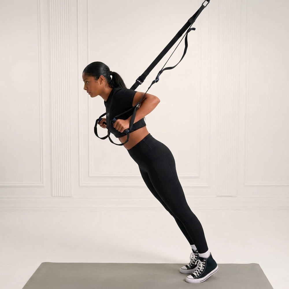 The Bodyweight Walking Calf Raise is performed using only body weight to target the calves. To perform, stand with feet shoulder-width apart, then raise onto the balls of your feet, lifting your heels off the ground. Engage your core and keep your back straight. While maintaining this elevated position, take small, controlled steps forward, avoiding any bouncing movement.