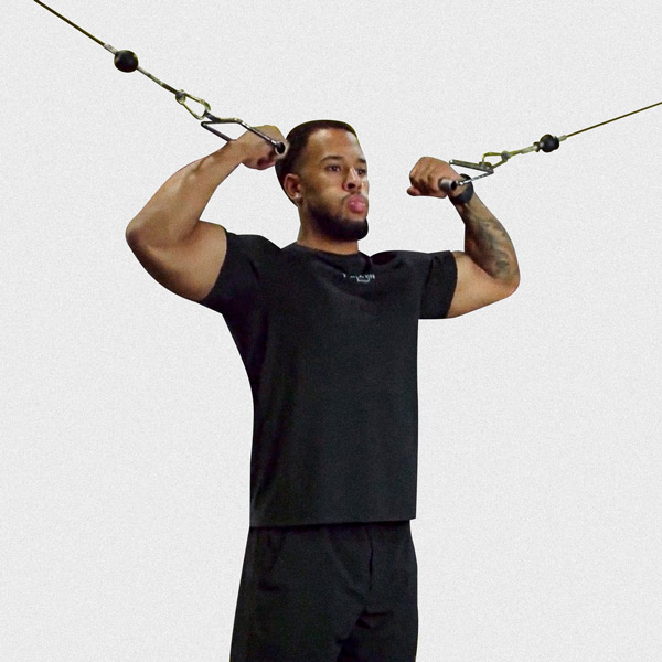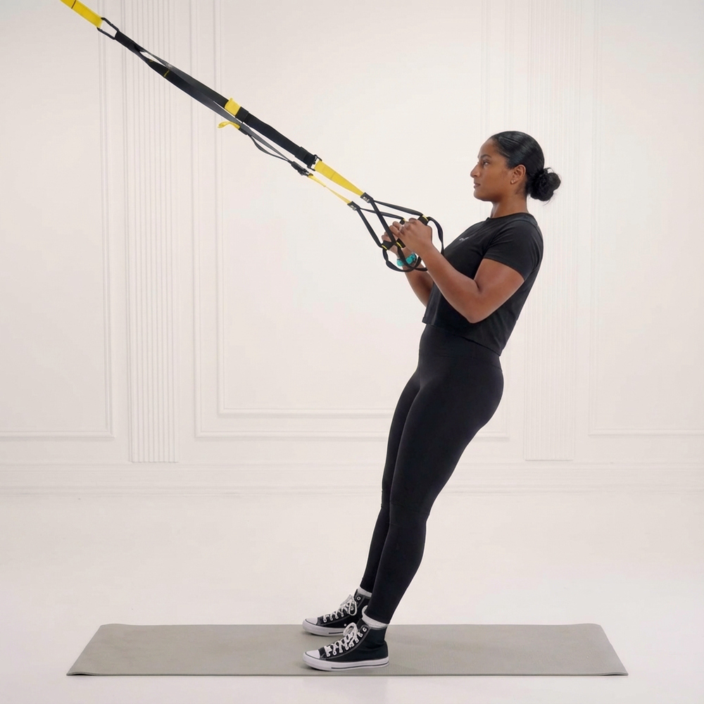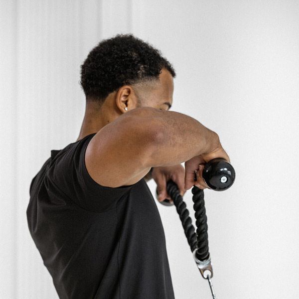 Attach rope to low pulley on cable machine. Stand facing machine with feet shoulder-width apart, grasp rope with neutral grip, arms extended toward thighs.