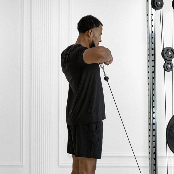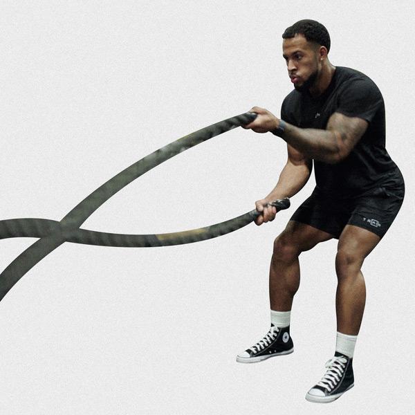 Exhale during the upward pull; inhale as you lower the rope. Brace core throughout.
