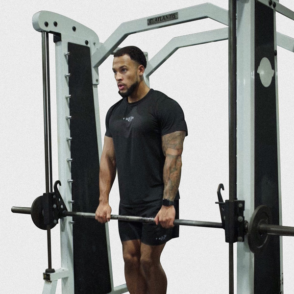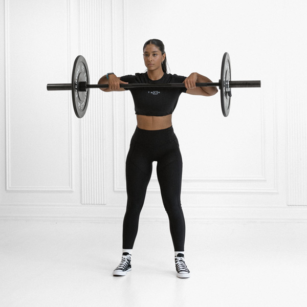 Set cable pulley to lowest position and attach rope. Stand facing machine with feet hip-width apart, grasp rope overhand wider than shoulders, arms extended.