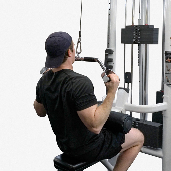 Start with arms fully extended overhead to feel lat stretch; end with hands at hips or thighs with full lat contraction.