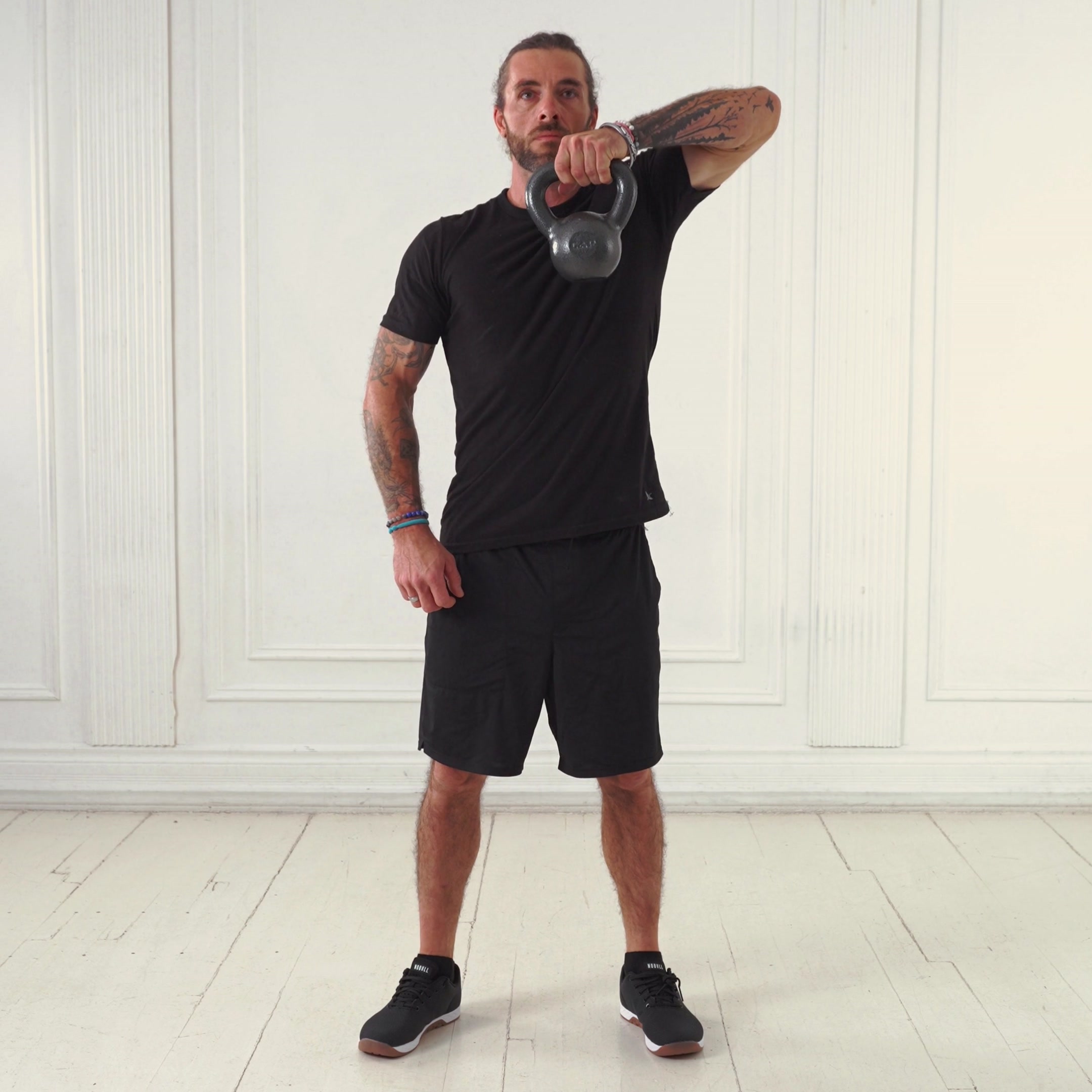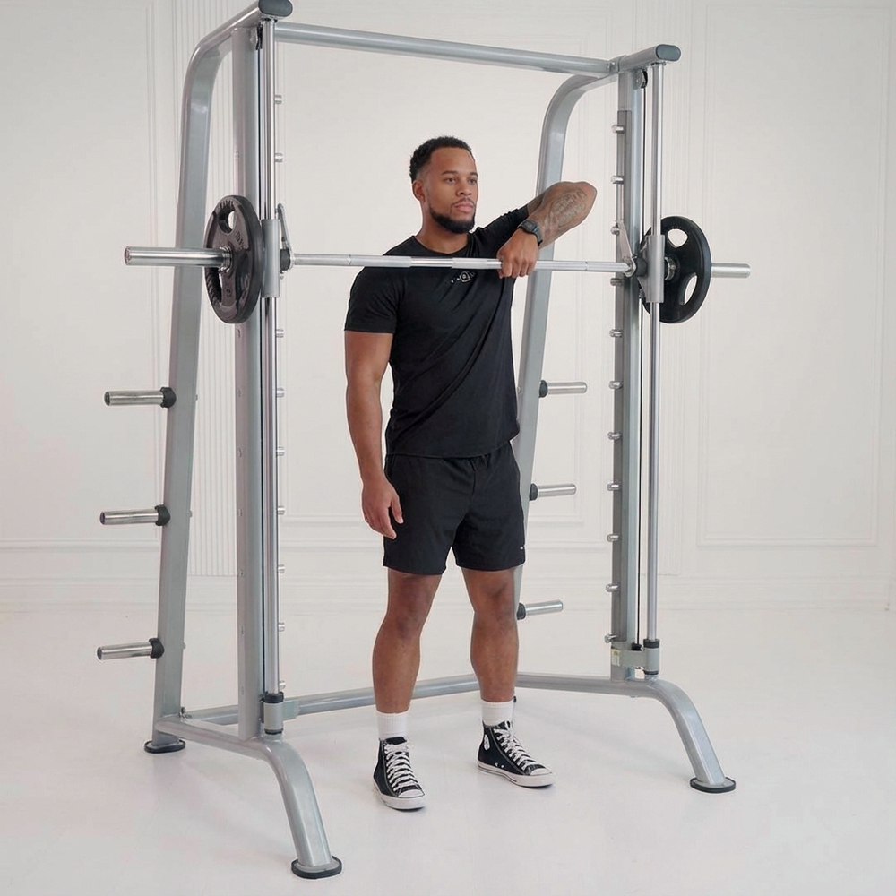 Adjust the cable pulley to shoulder height and attach a D-handle. Stand sideways to the machine with the far hand gripping the cable, arm extended across the body, and the other hand stabilizing on the frame.