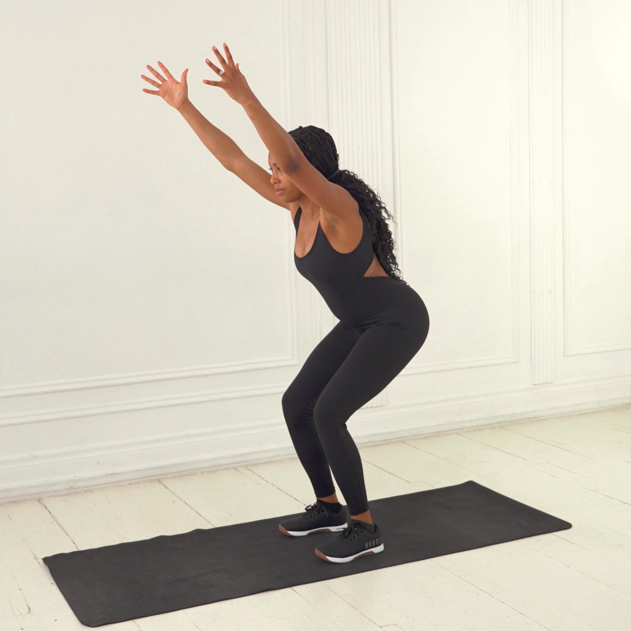 Stand in Captain's Chair with forearms on padded armrests, grip handles, back against pad, legs hanging straight down, core engaged.