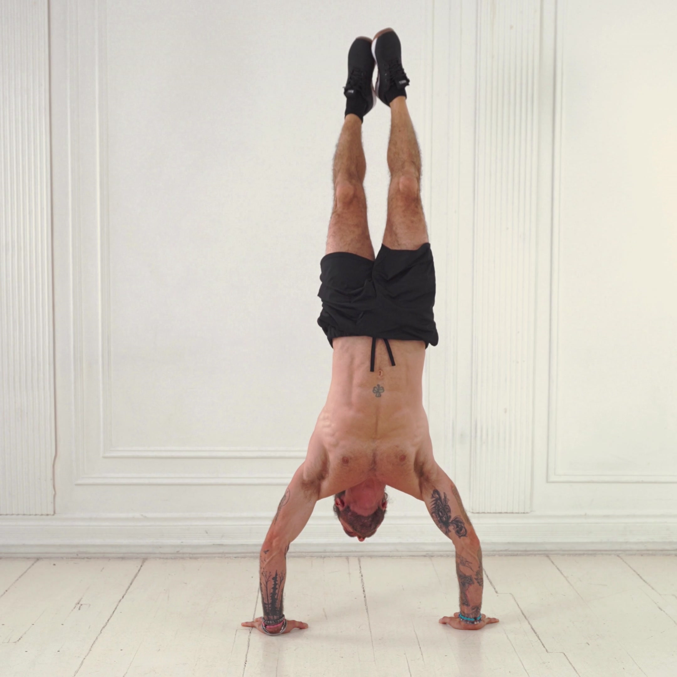 Stand tall with feet hip-width apart, knees slightly bent. Reach arms behind back and interlace fingers with palms facing inward or outward.