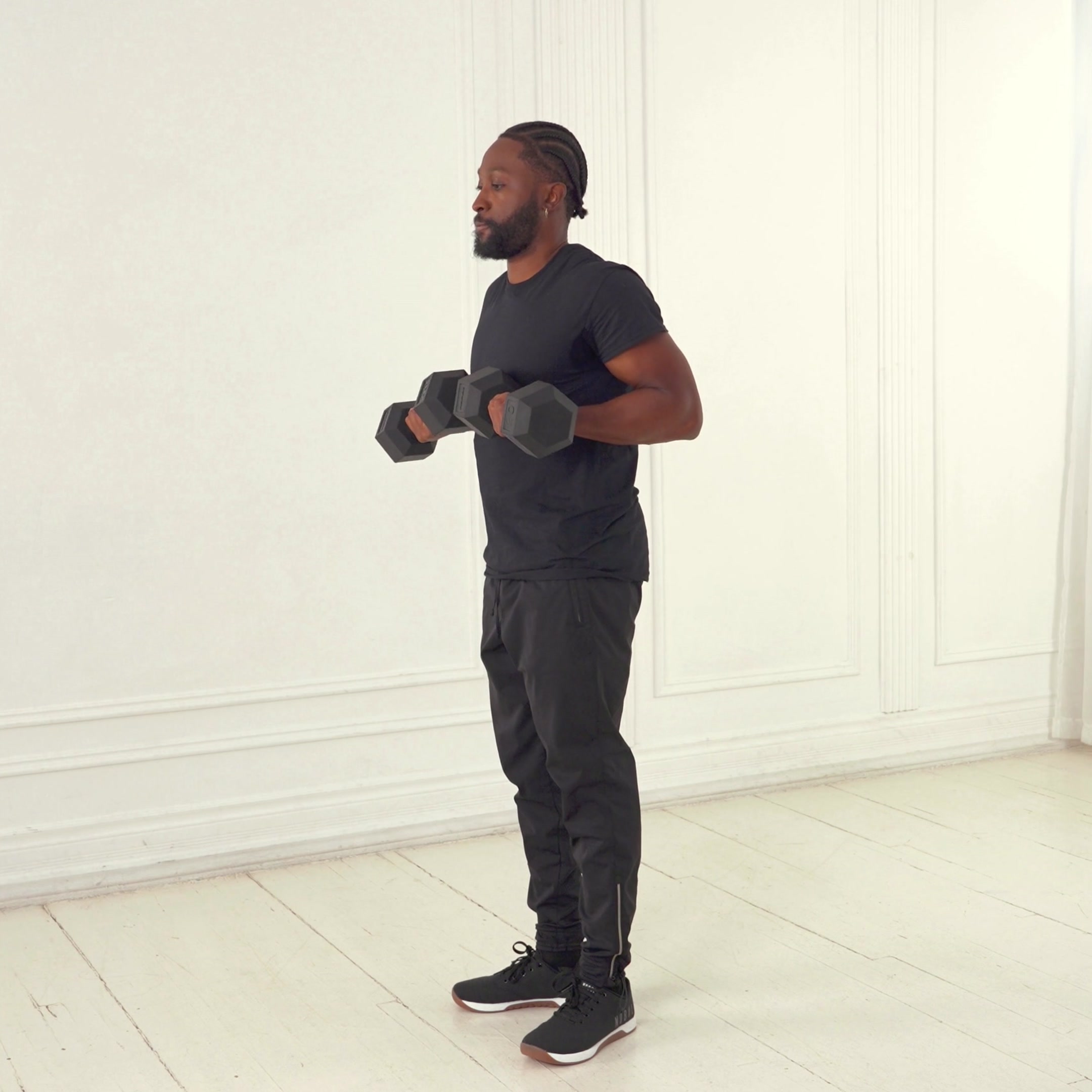 Inhale during the lowering phase; exhale as you curl the weights up. Brace core throughout.