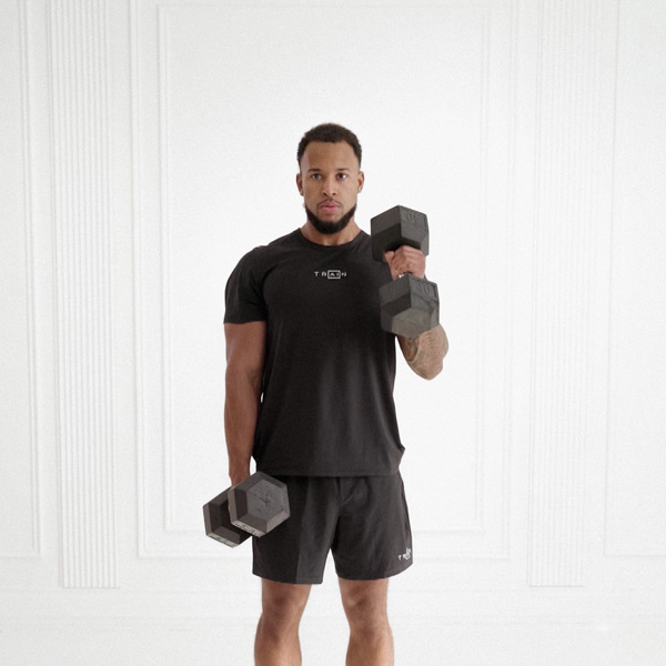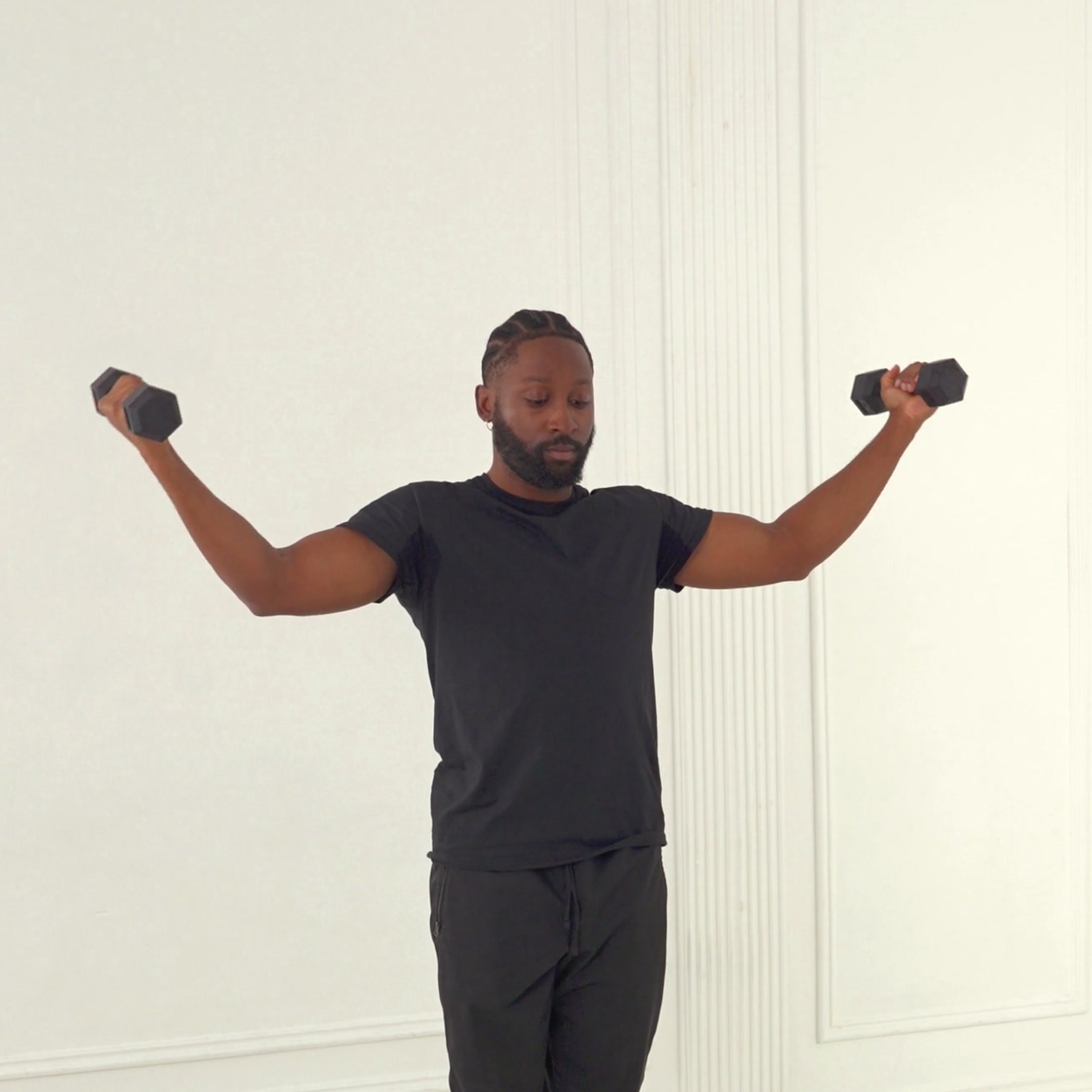 Stand with feet shoulder-width apart, knees slightly bent. Hold dumbbells at sides with palms facing forward, arms extended, core engaged, and shoulders back.