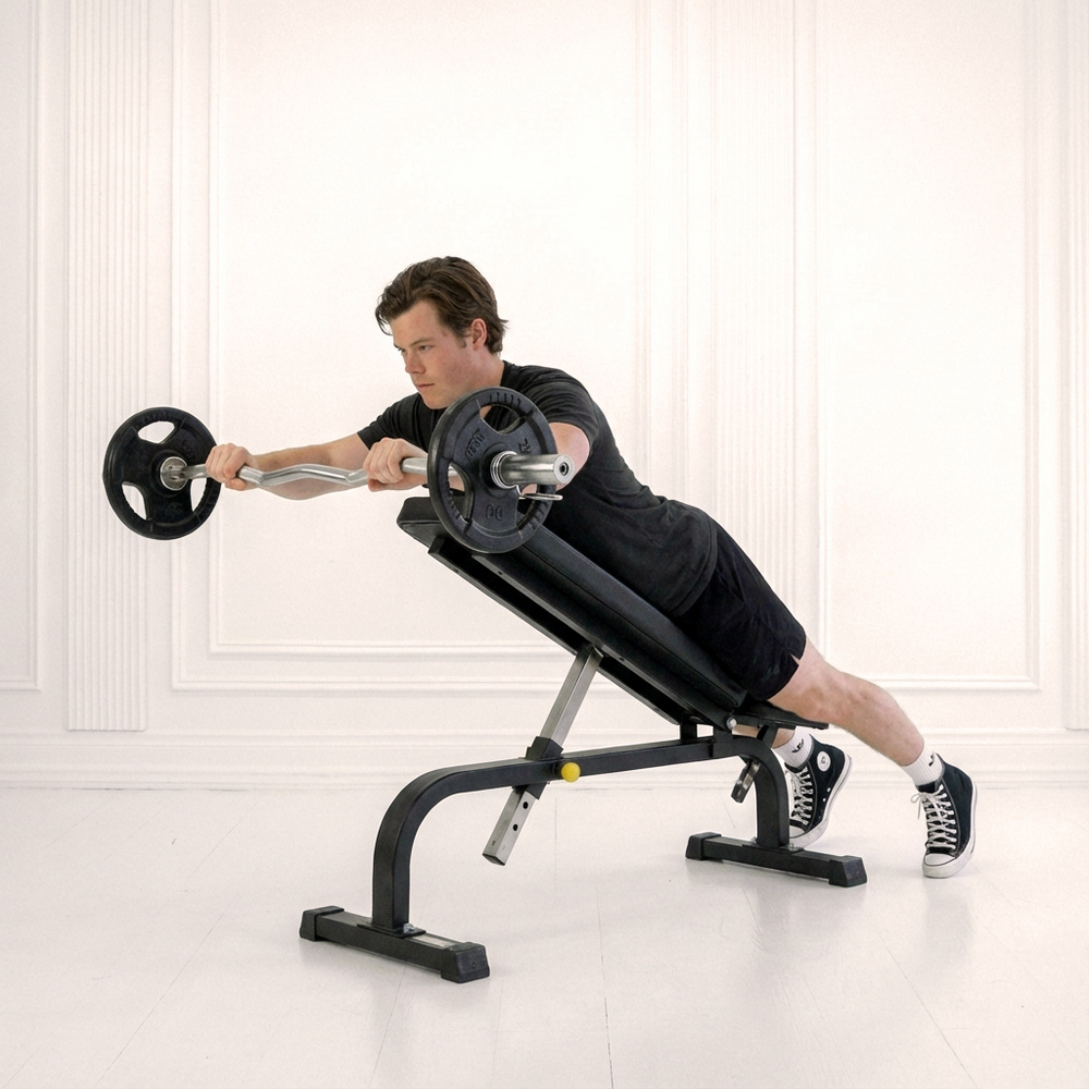 Adjust an incline bench to 30-45 degrees. Lie face down with chest and stomach supported, arms hanging straight down gripping dumbbells with palms facing each other.