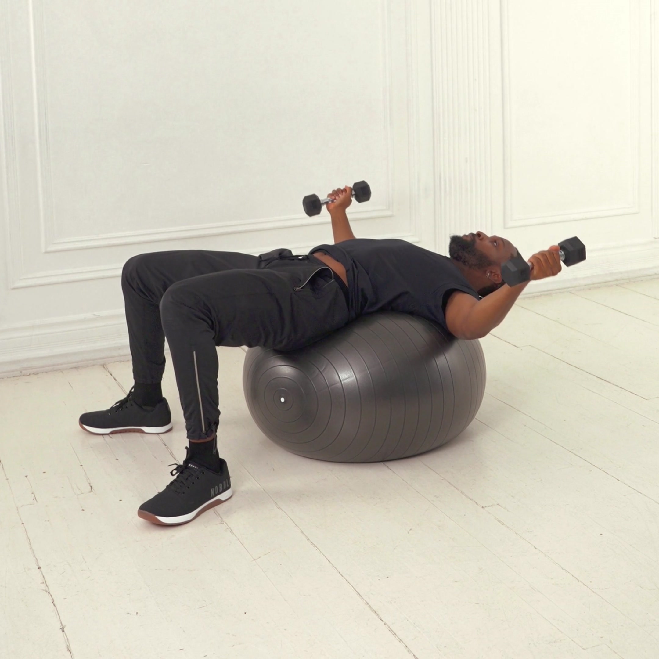 Inhale during the lowering phase and exhale as you bring the weights back up, bracing your core throughout.
