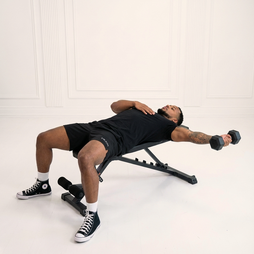 An isolation exercise using dumbbells on a flat bench to target the pectoralis major through horizontal adduction, building chest hypertrophy and improving shoulder mobility; commonly performed for upper body definition.