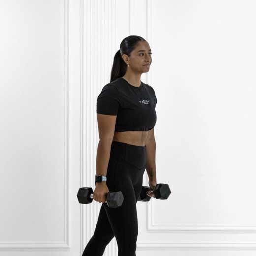 Inhale as you lower the weights; exhale as you curl upward and brace core.