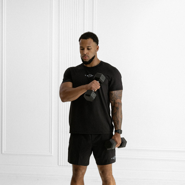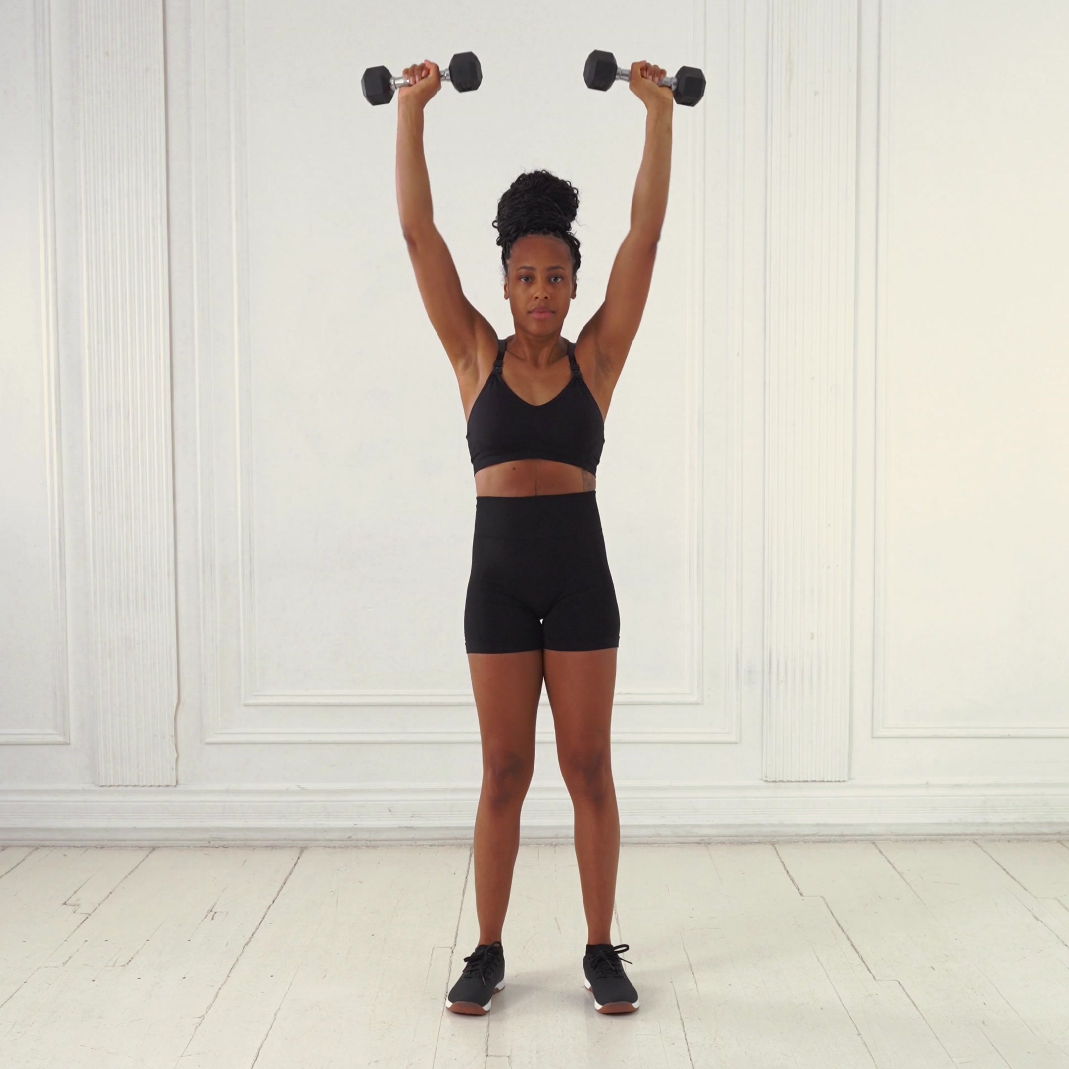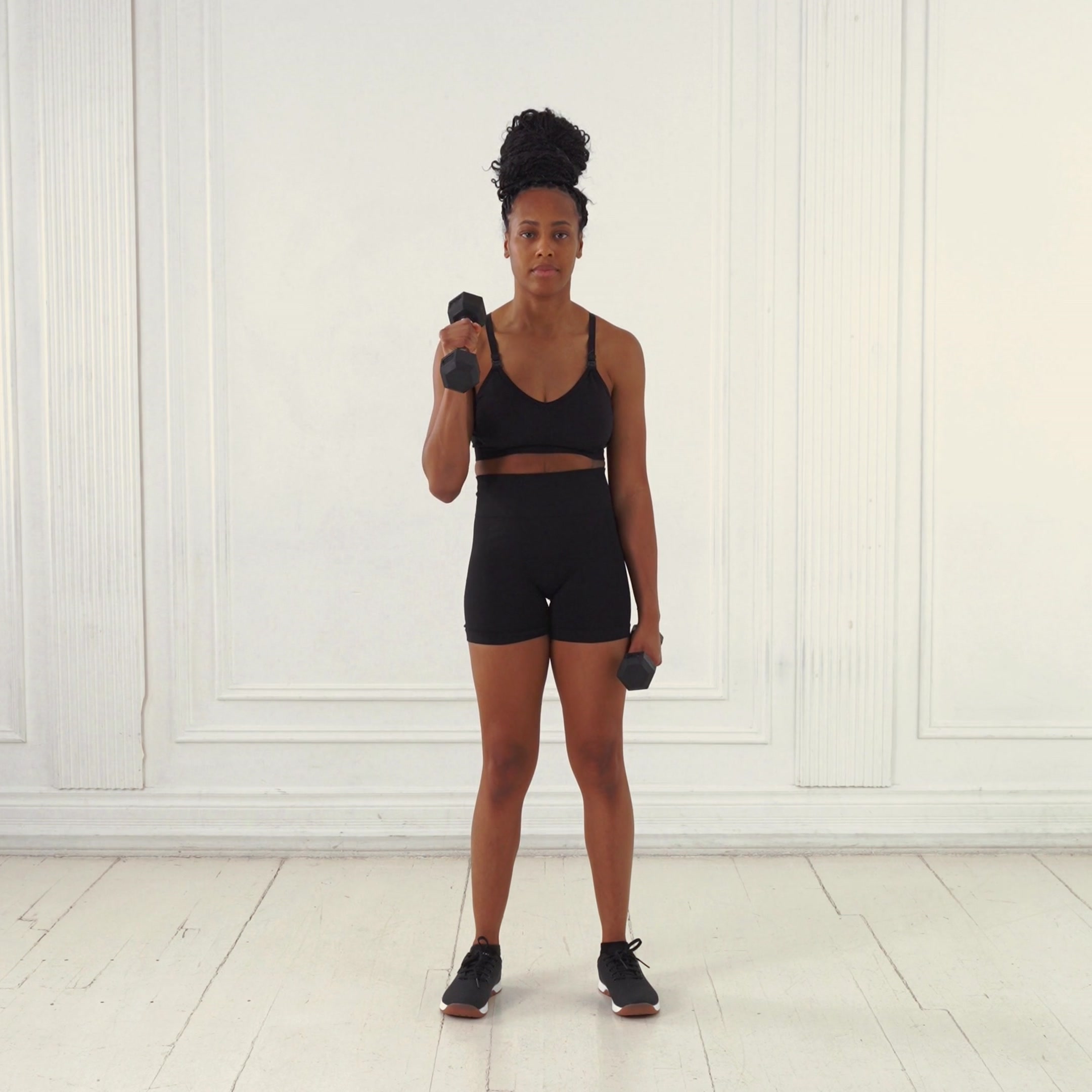 Stand with feet hip-width apart, holding a dumbbell in each hand at your sides with palms facing inward and elbows extended.