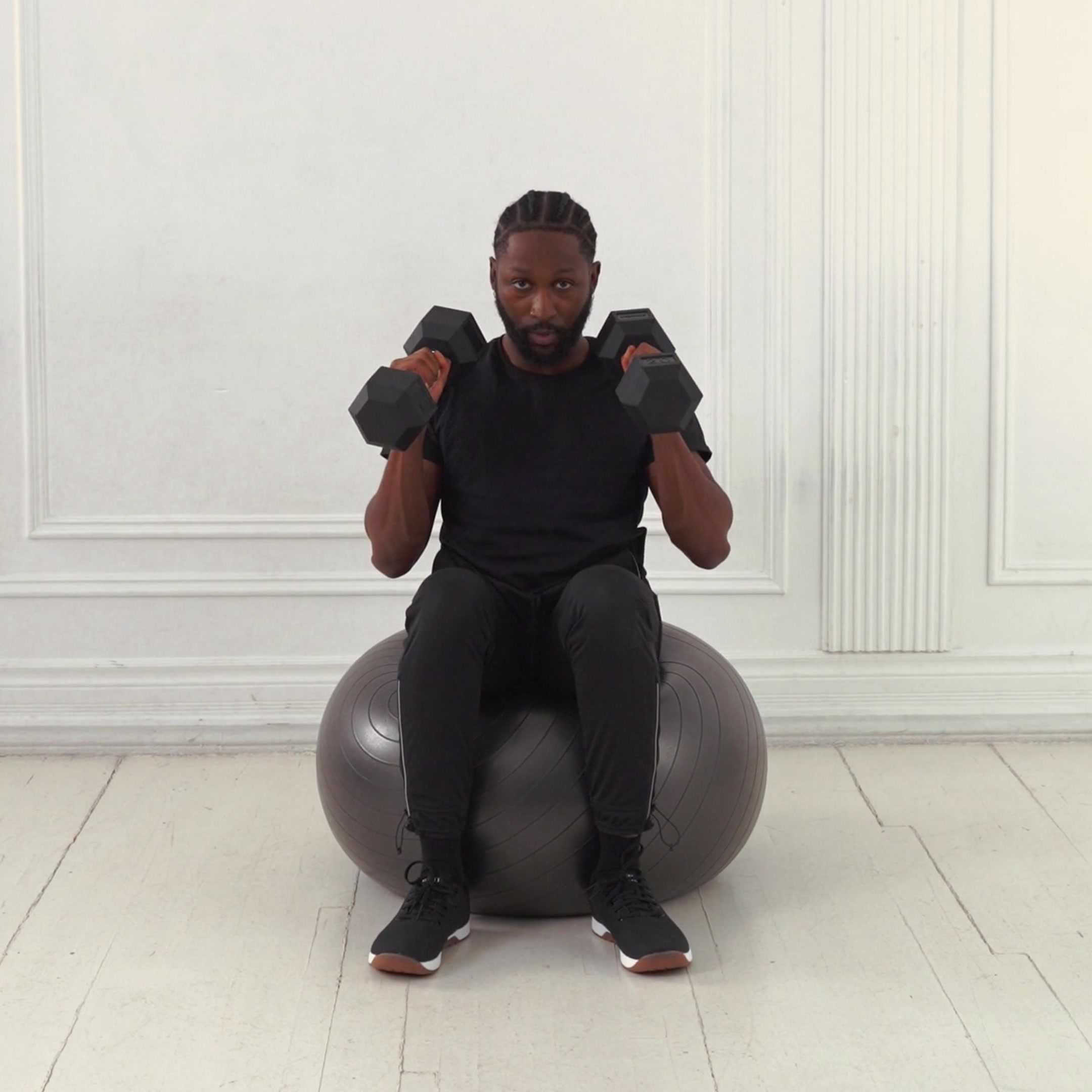 Inhale as you lower the weights, exhale as you curl upward while bracing your core.