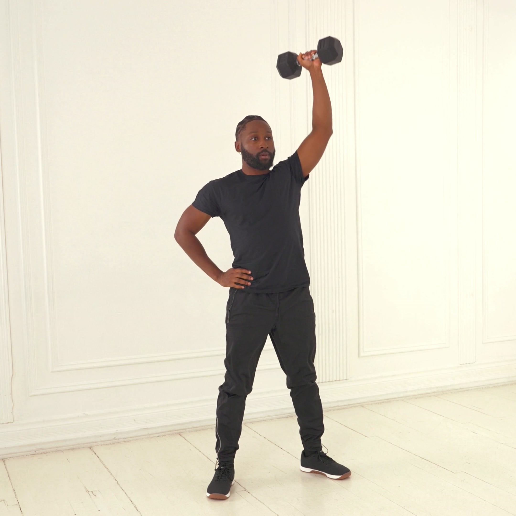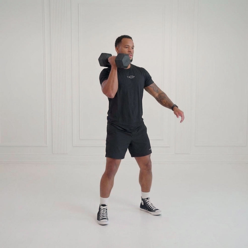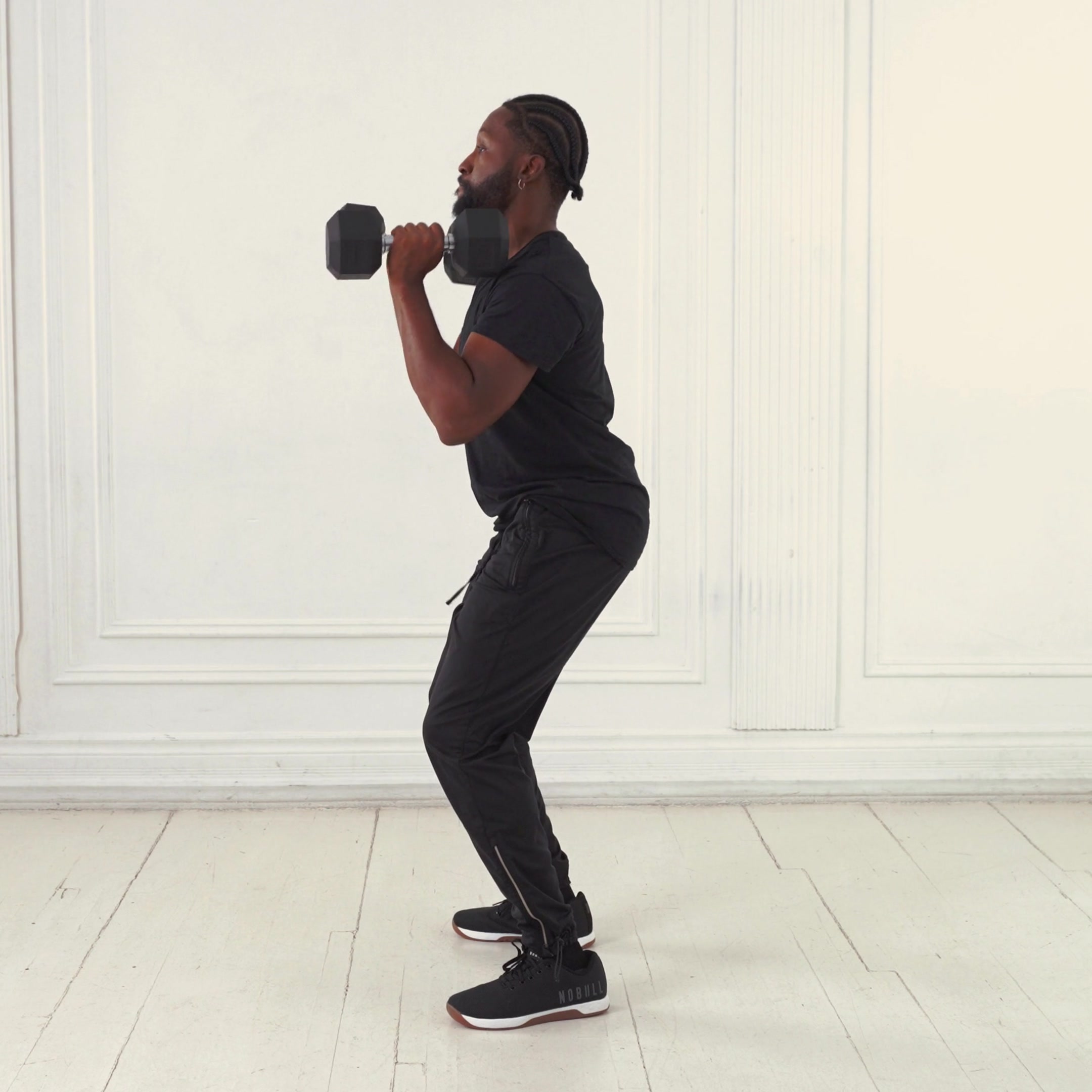 Lower to mid-thigh hang with knees slightly bent; catch in quarter squat with elbows high and dumbbells on shoulders; full hip and knee extension at top.