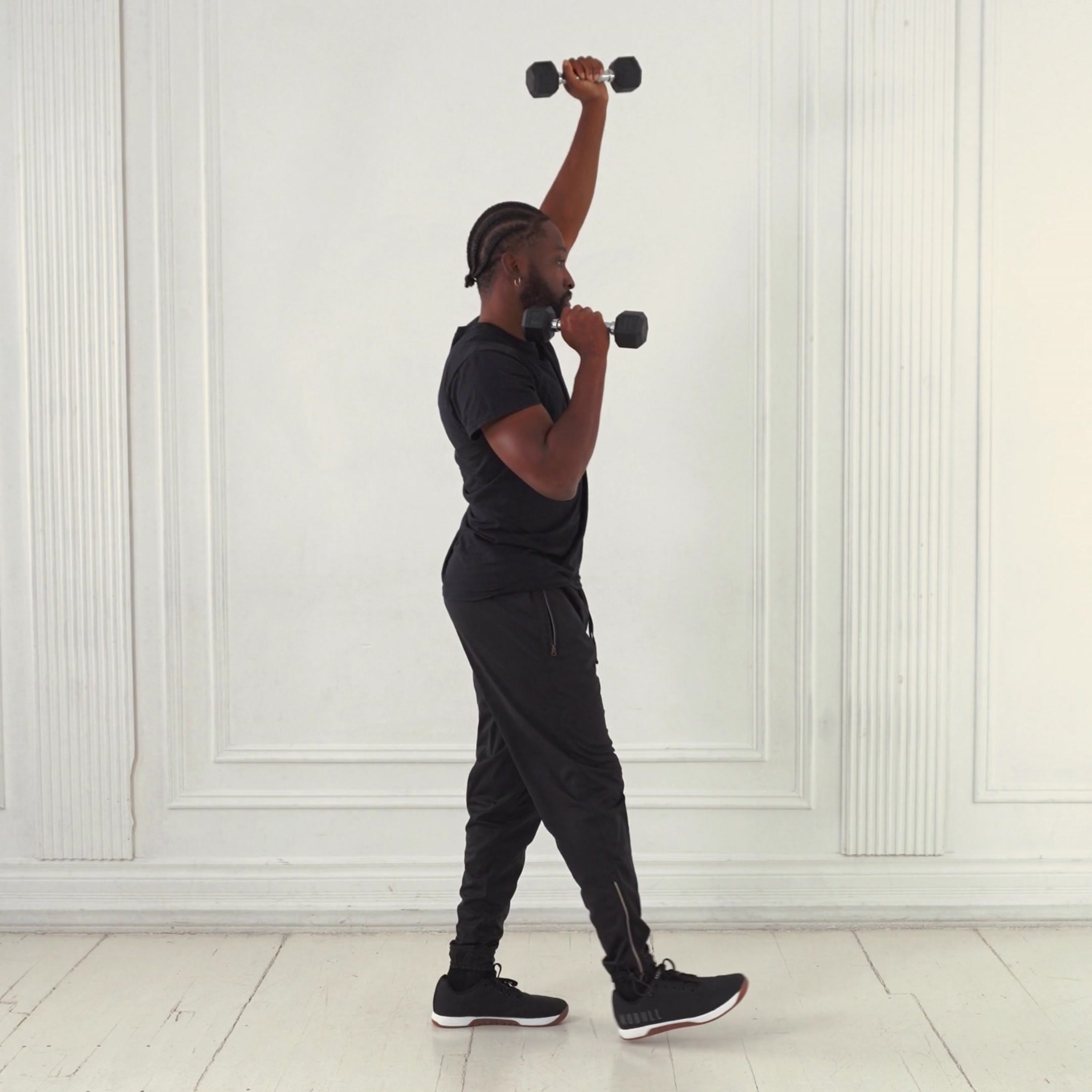 Lower to just above knees in hinge, explode upward until elbows are high and dumbbells reach shoulder height without full lockout.