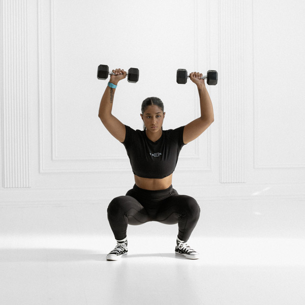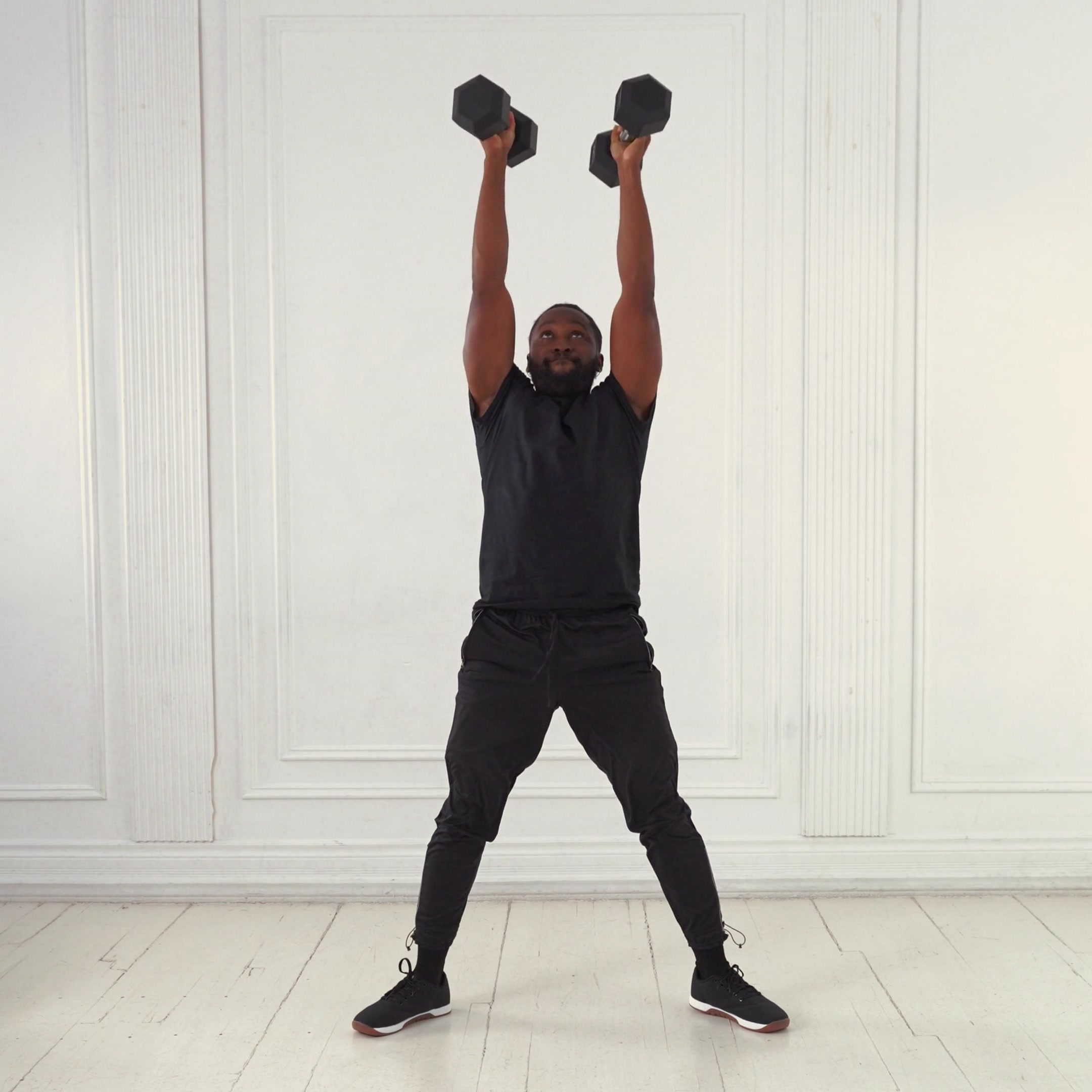 Inhale as you lower hips, exhale forcefully as you drive up and squeeze glutes.