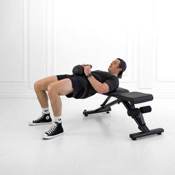 Sit on the floor with upper back against a bench edge, knees bent, feet flat hip-width apart. Place a dumbbell across your hips and hold it steady.