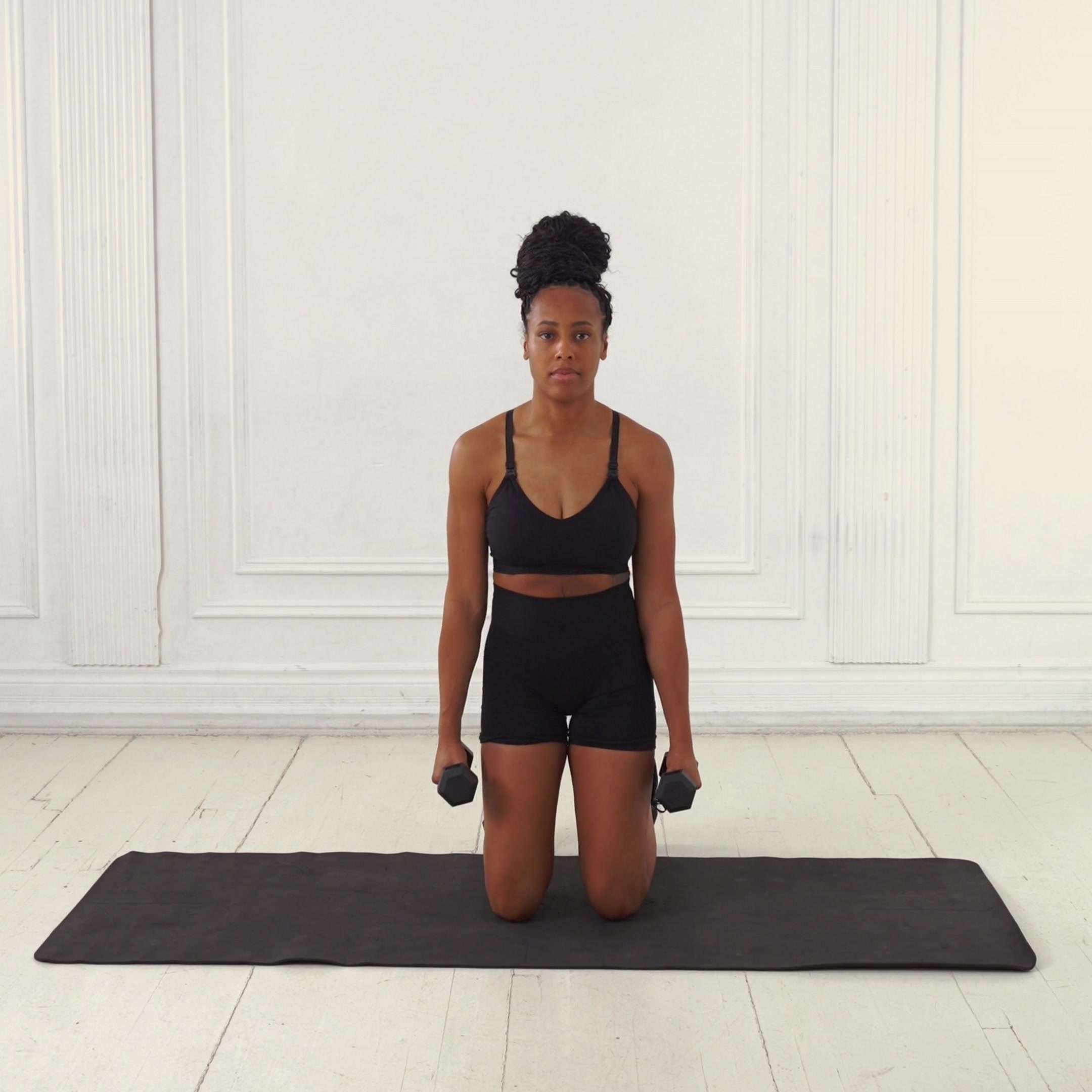 Kneel tall on a mat with knees hip-width apart. Press two dumbbells overhead with arms fully extended and palms facing each other.