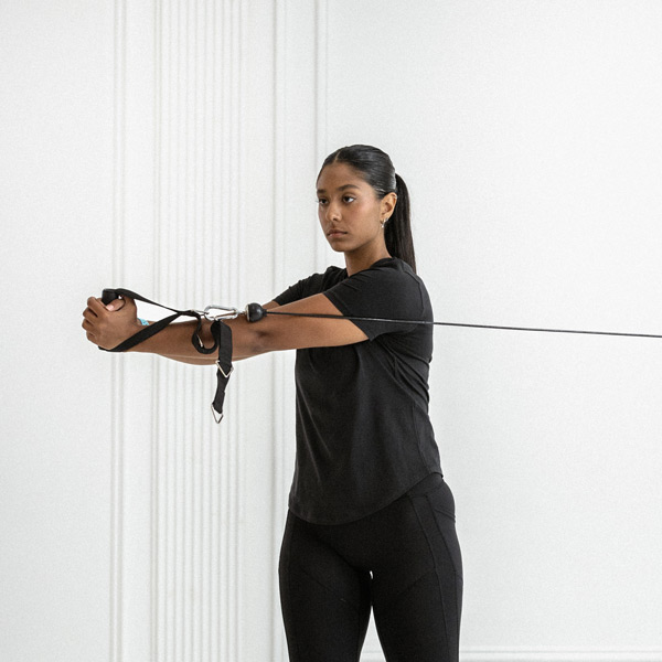 Move from hip level on kneeling side to full extension above opposite shoulder, keeping spine neutral without excessive twist.