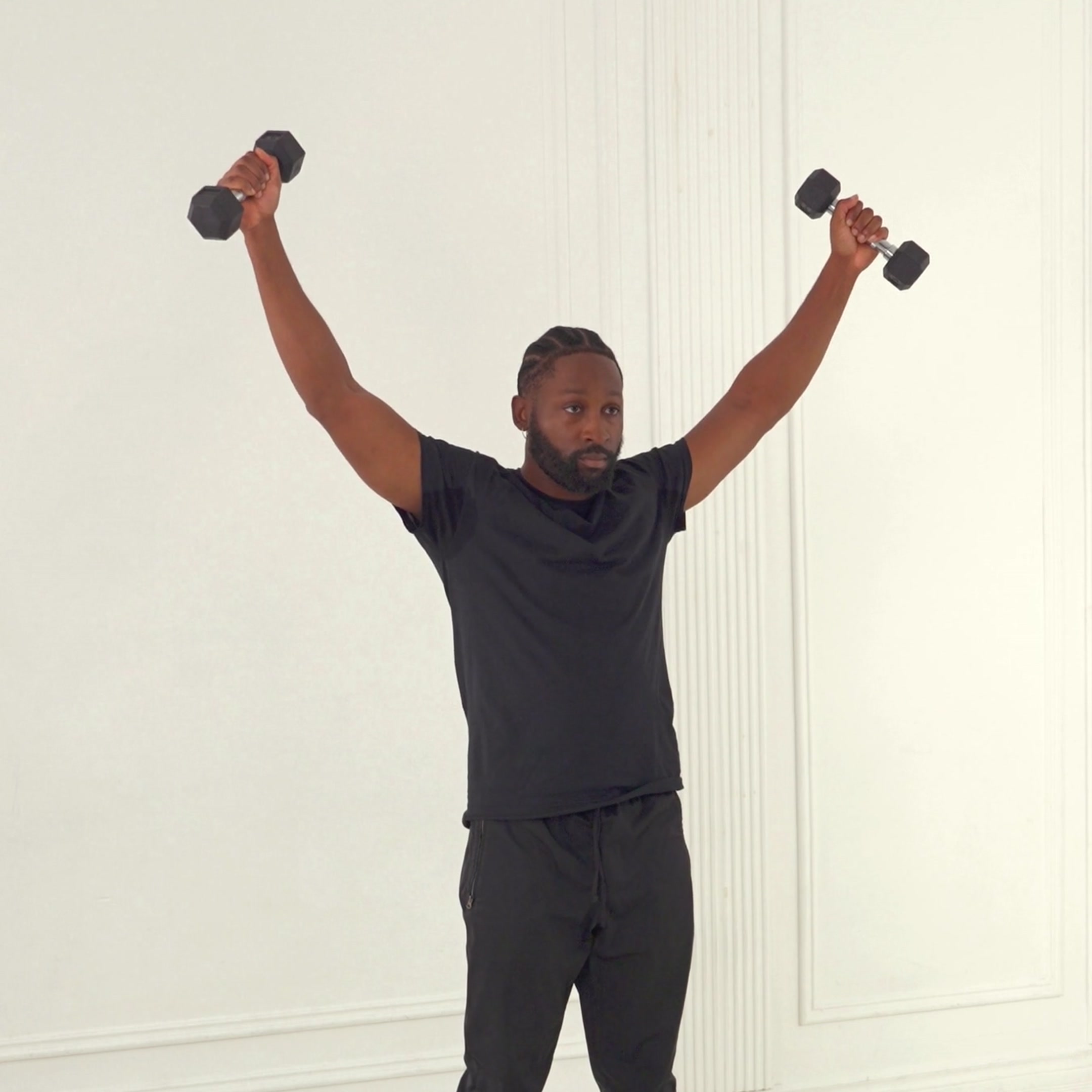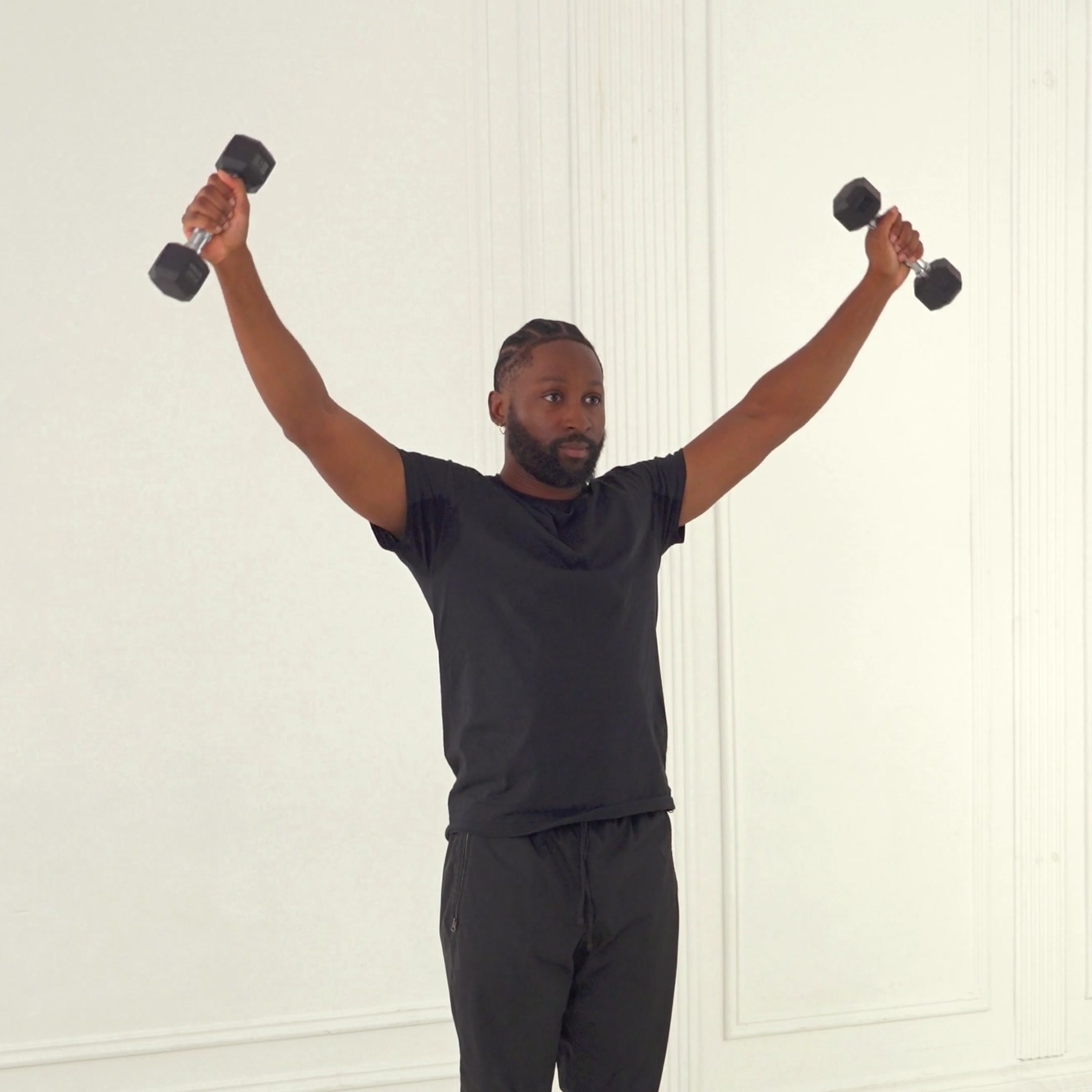 Stand tall with feet shoulder-width apart, knees slightly bent. Hold dumbbells at your sides with palms facing in and elbows softly bent.