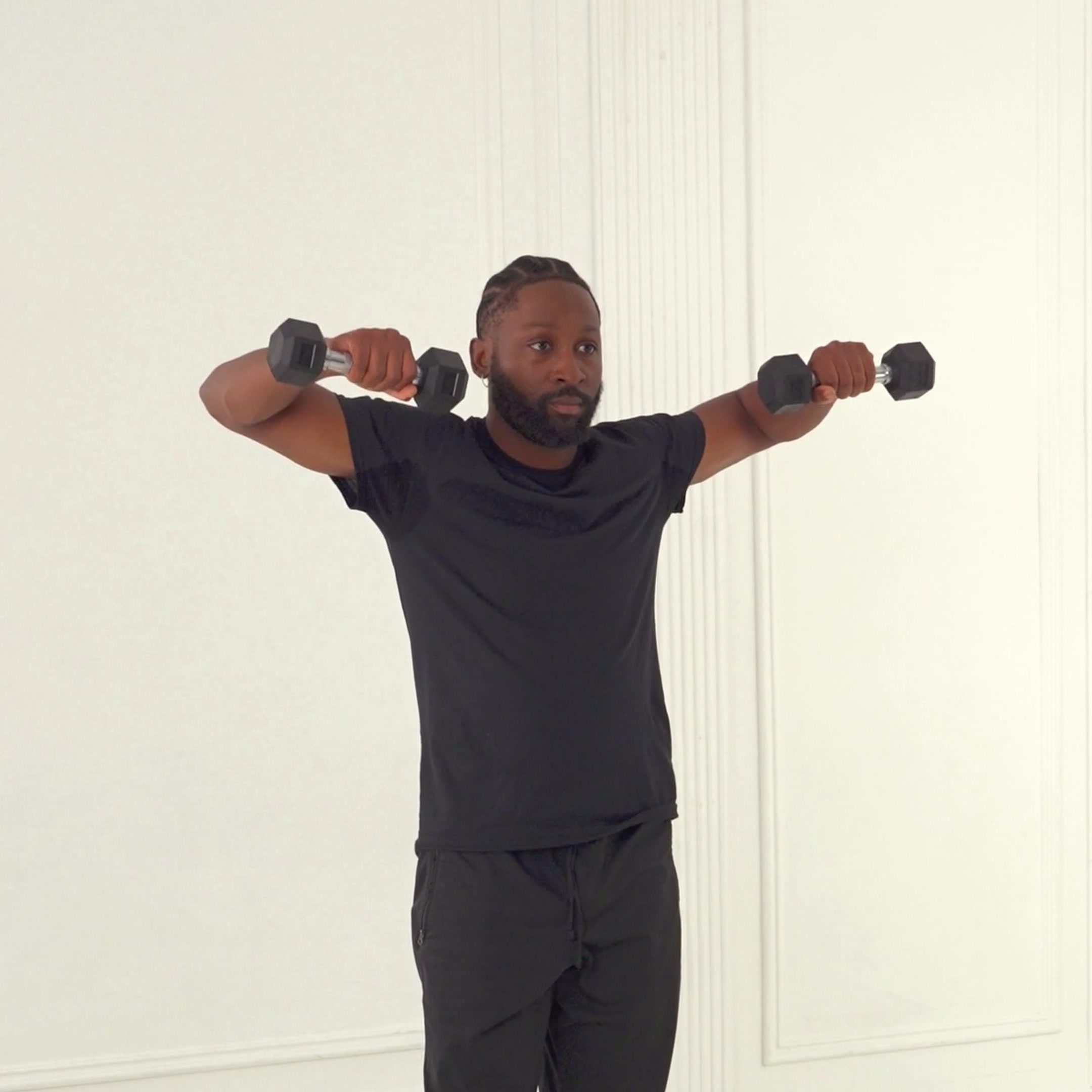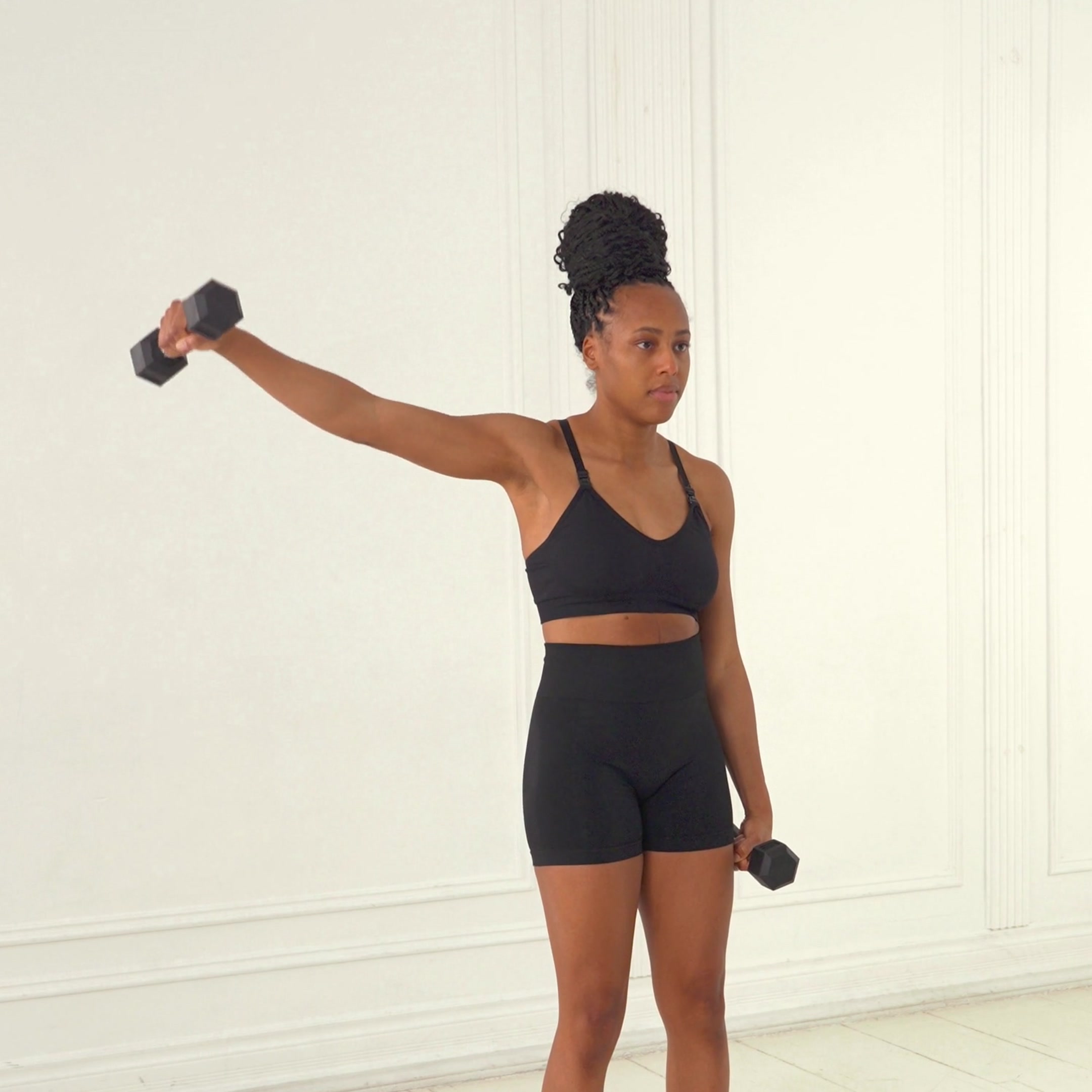 An isolation exercise using dumbbells to target the lateral deltoids for building shoulder width and stability; commonly programmed for hypertrophy and upper body aesthetics.