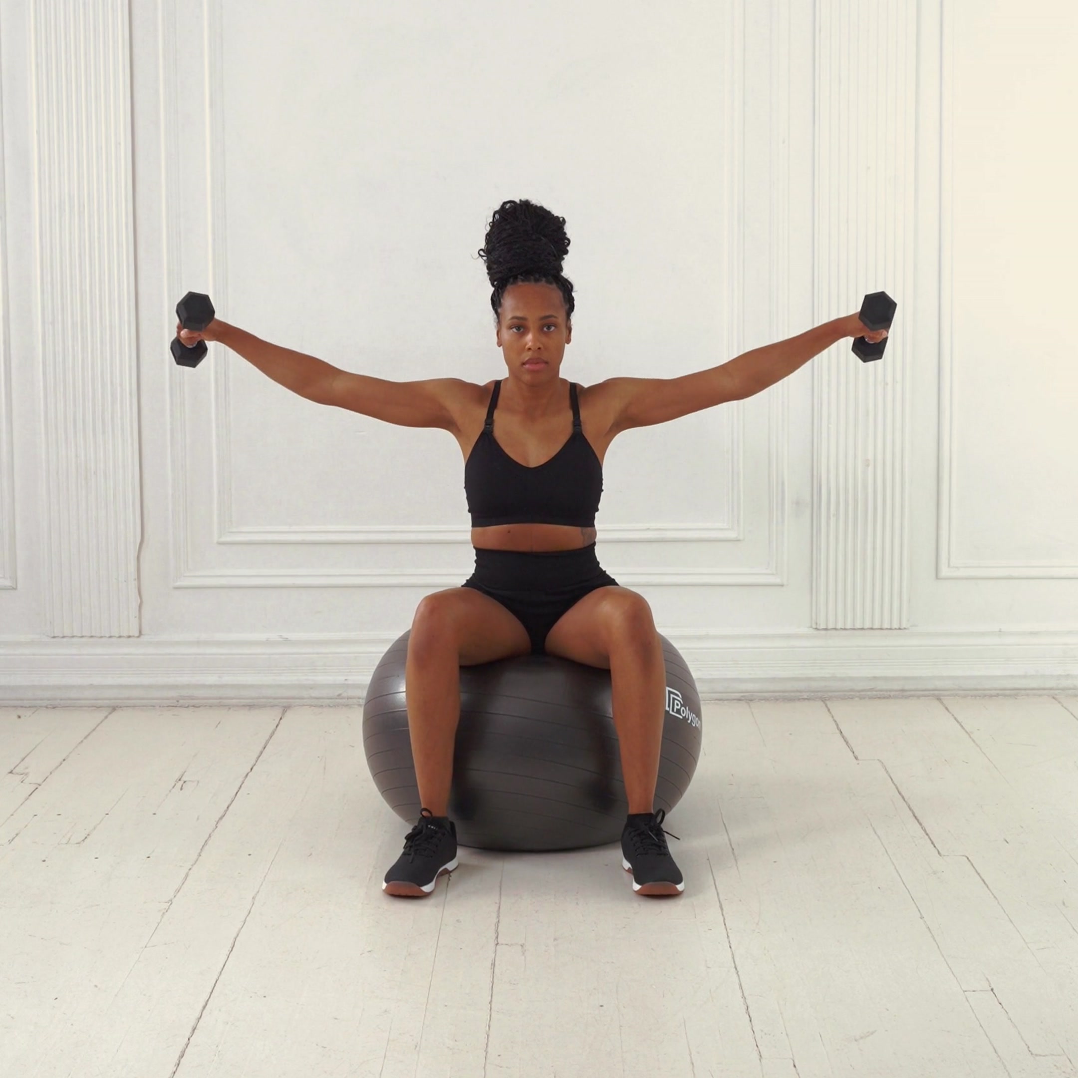 Raise arms from hanging at sides to parallel with the floor or just below shoulder height; avoid going higher.