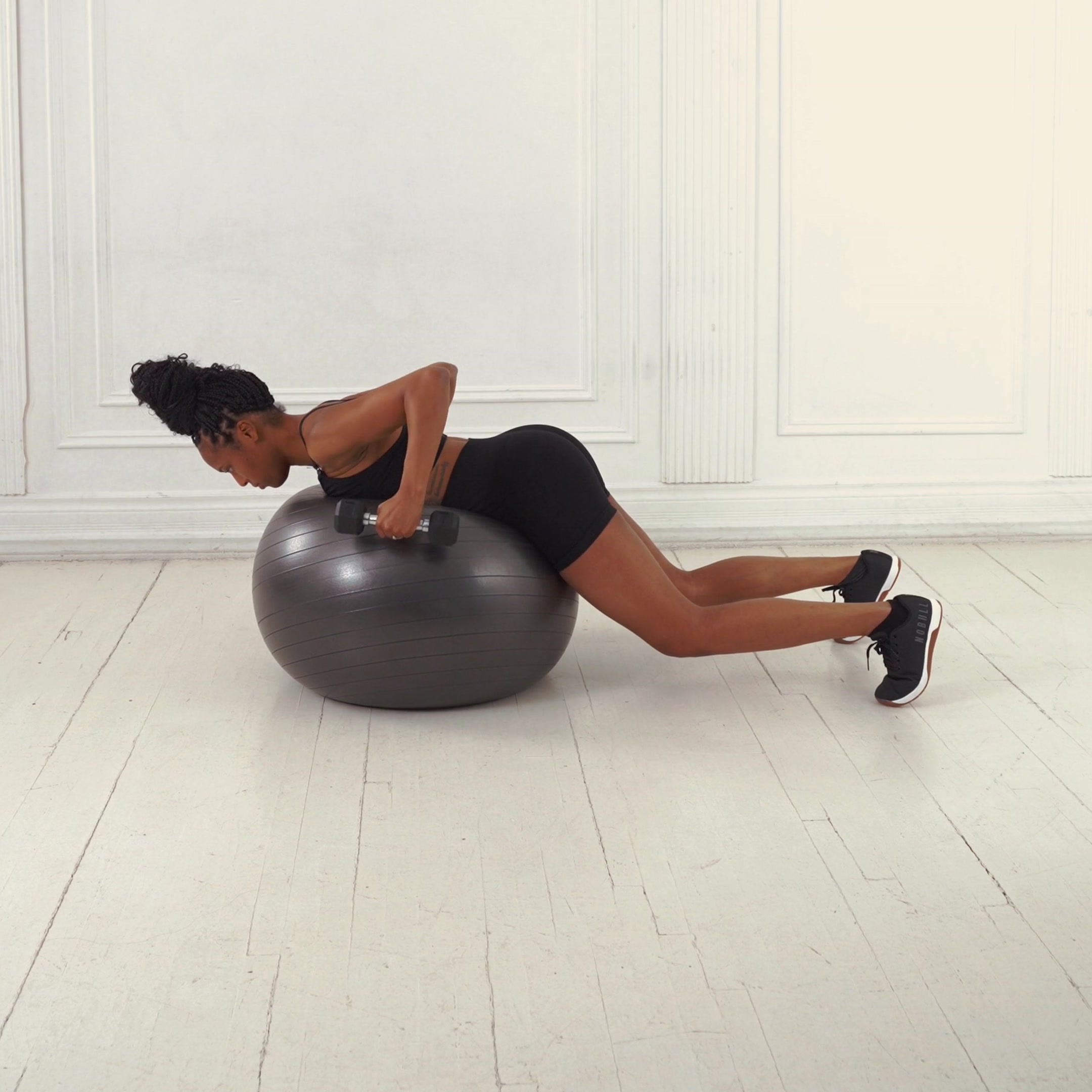 Dumbbell pullover on a stability ball that targets lats and chest while engaging core for stability; builds upper body strength, muscular definition, and shoulder mobility.