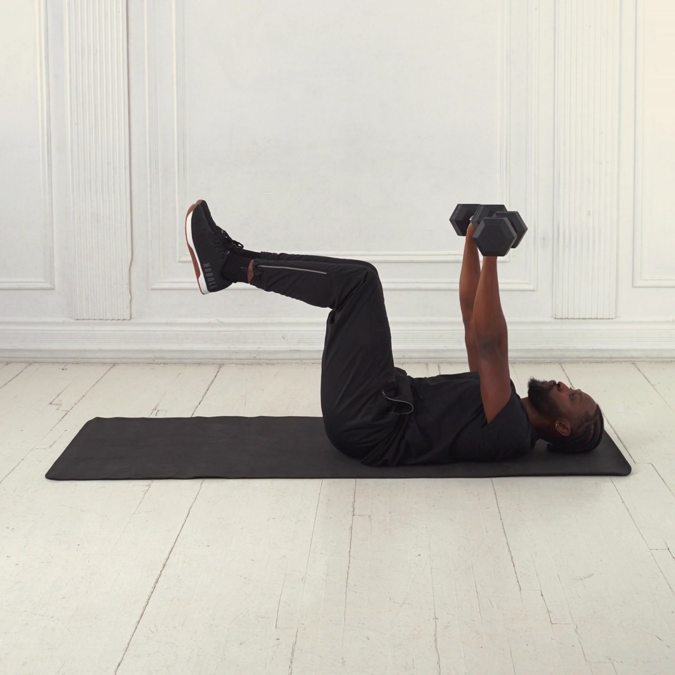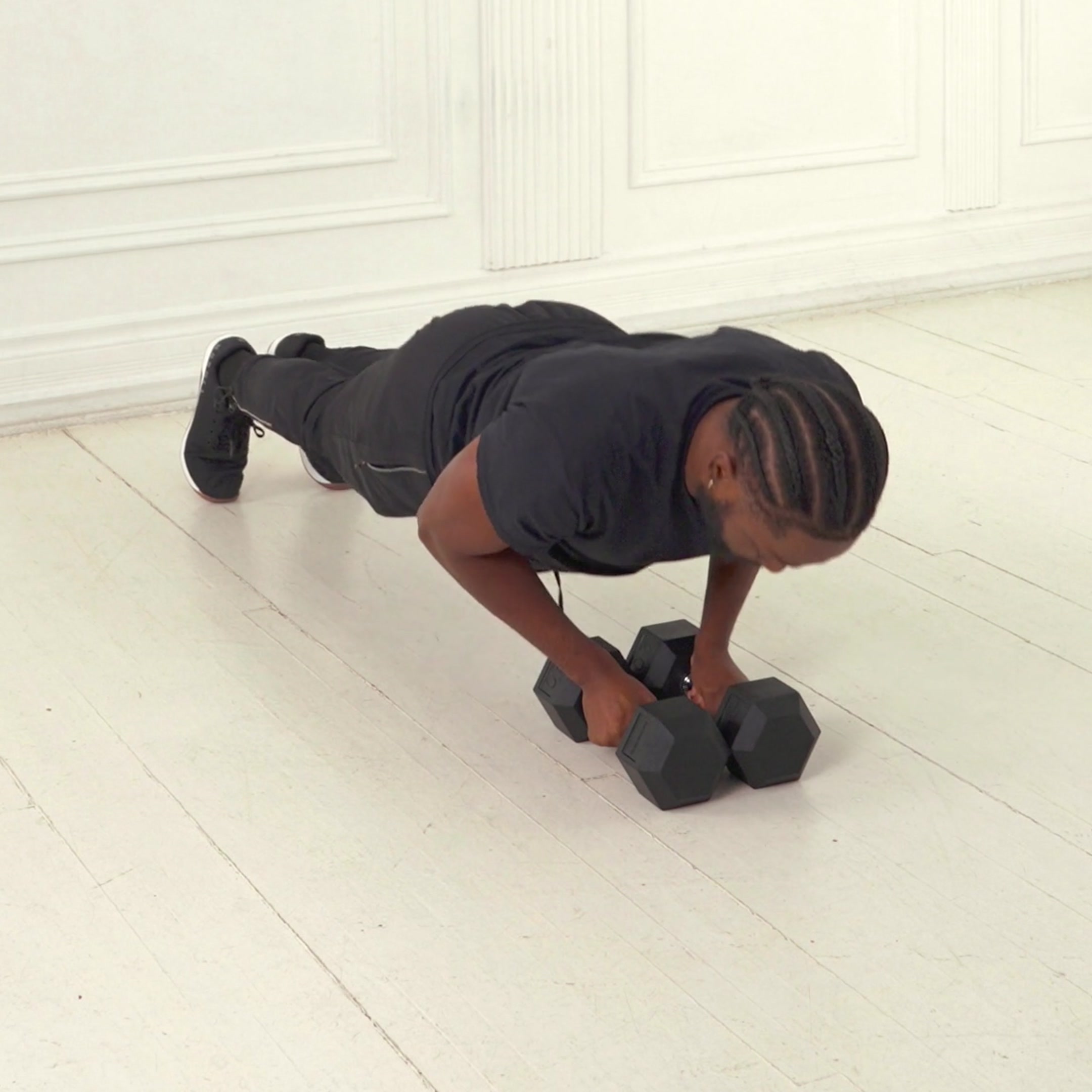 Place two dumbbells on the floor shoulder-width apart. Grip them in a high plank position with body straight from head to heels, feet wider than shoulders for stability.