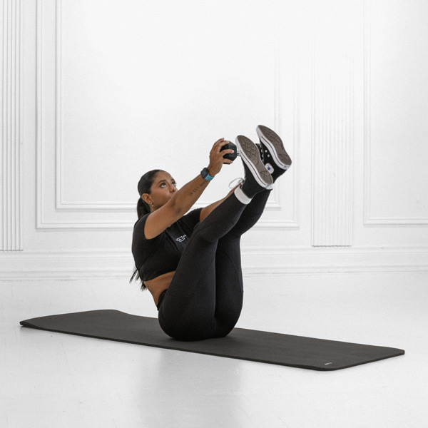 Lie flat on your back on a mat. Grip a dumbbell behind your head with both hands, arms extended straight, and bend knees to 90 degrees toward chest.
