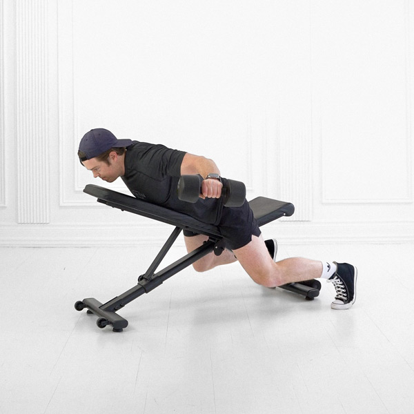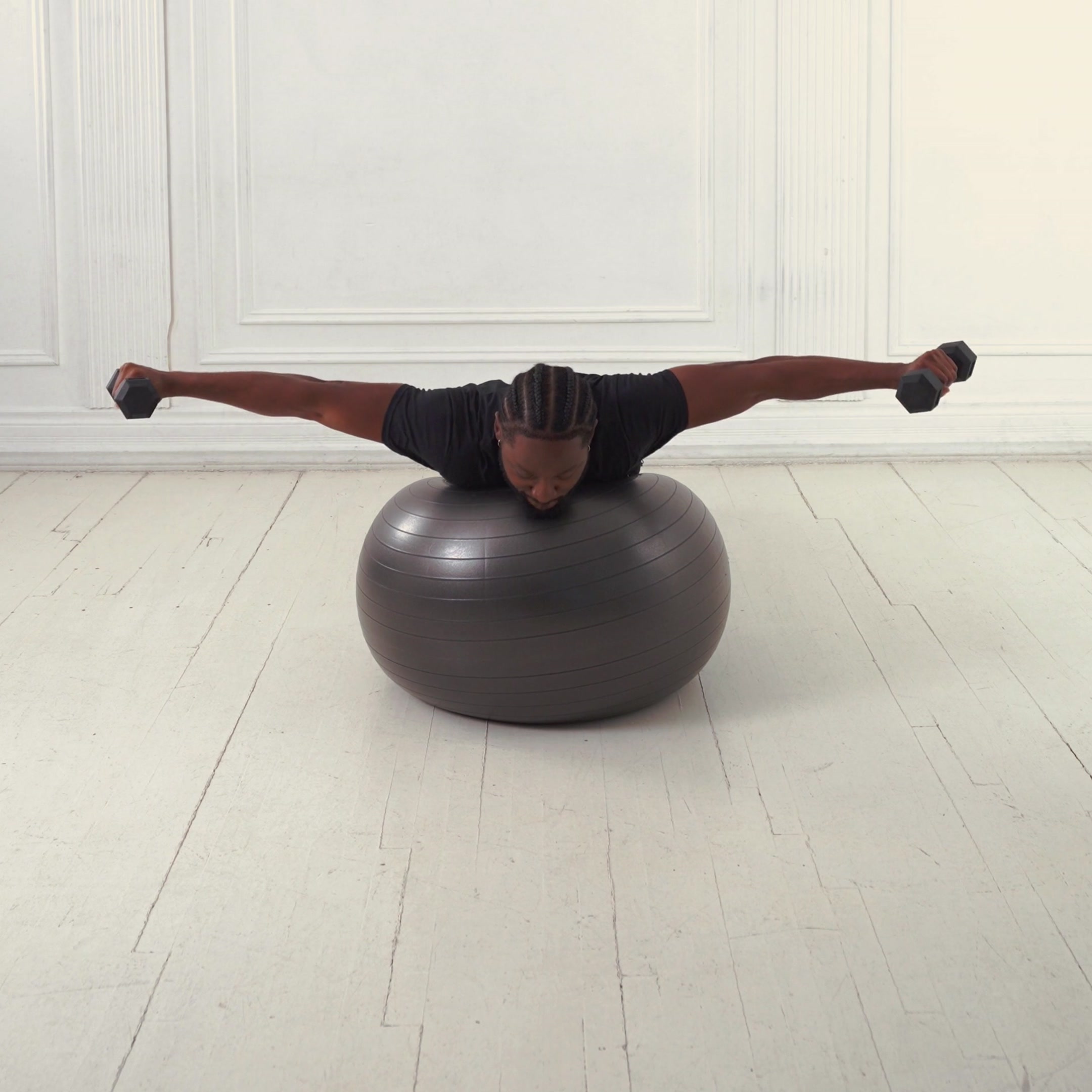 Exhale as you raise the dumbbells, inhale as you lower them. Brace core to stabilize spine.