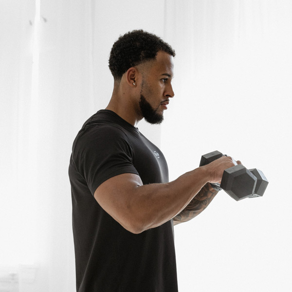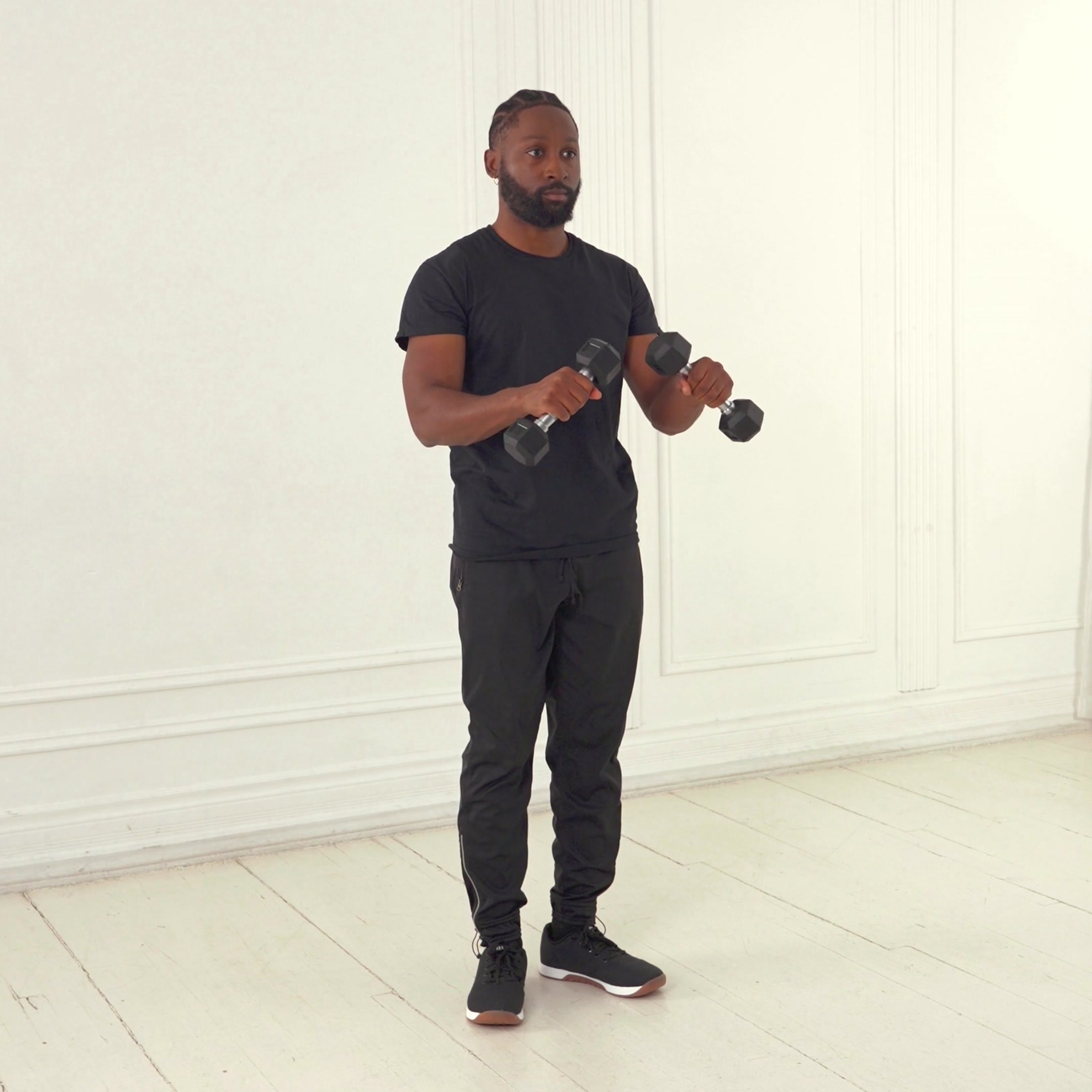 Full elbow flexion until dumbbells reach shoulder level, then extend arms fully without locking elbows to keep tension on muscles.