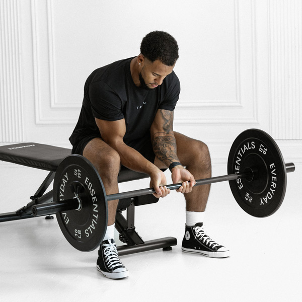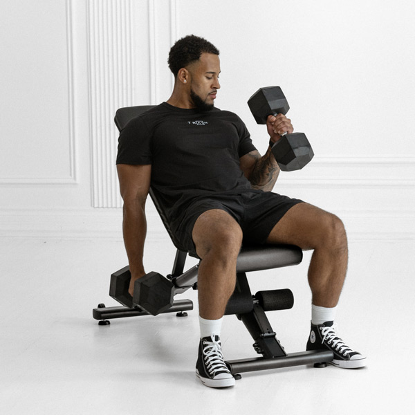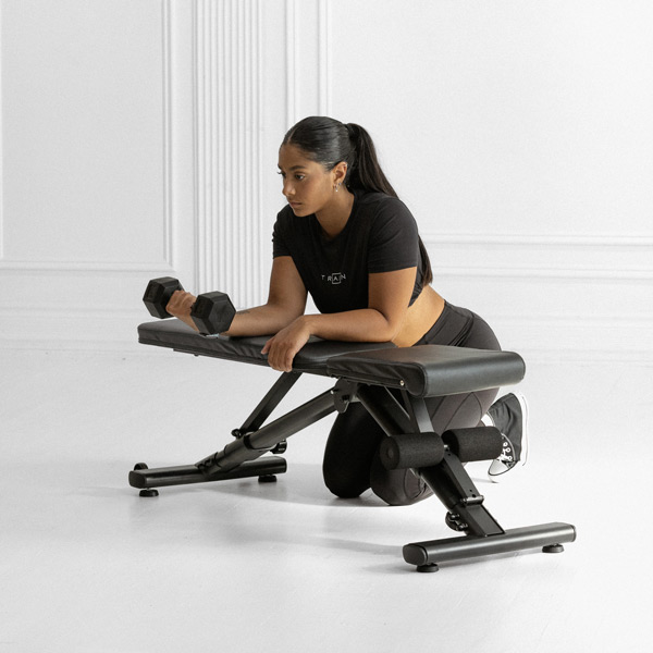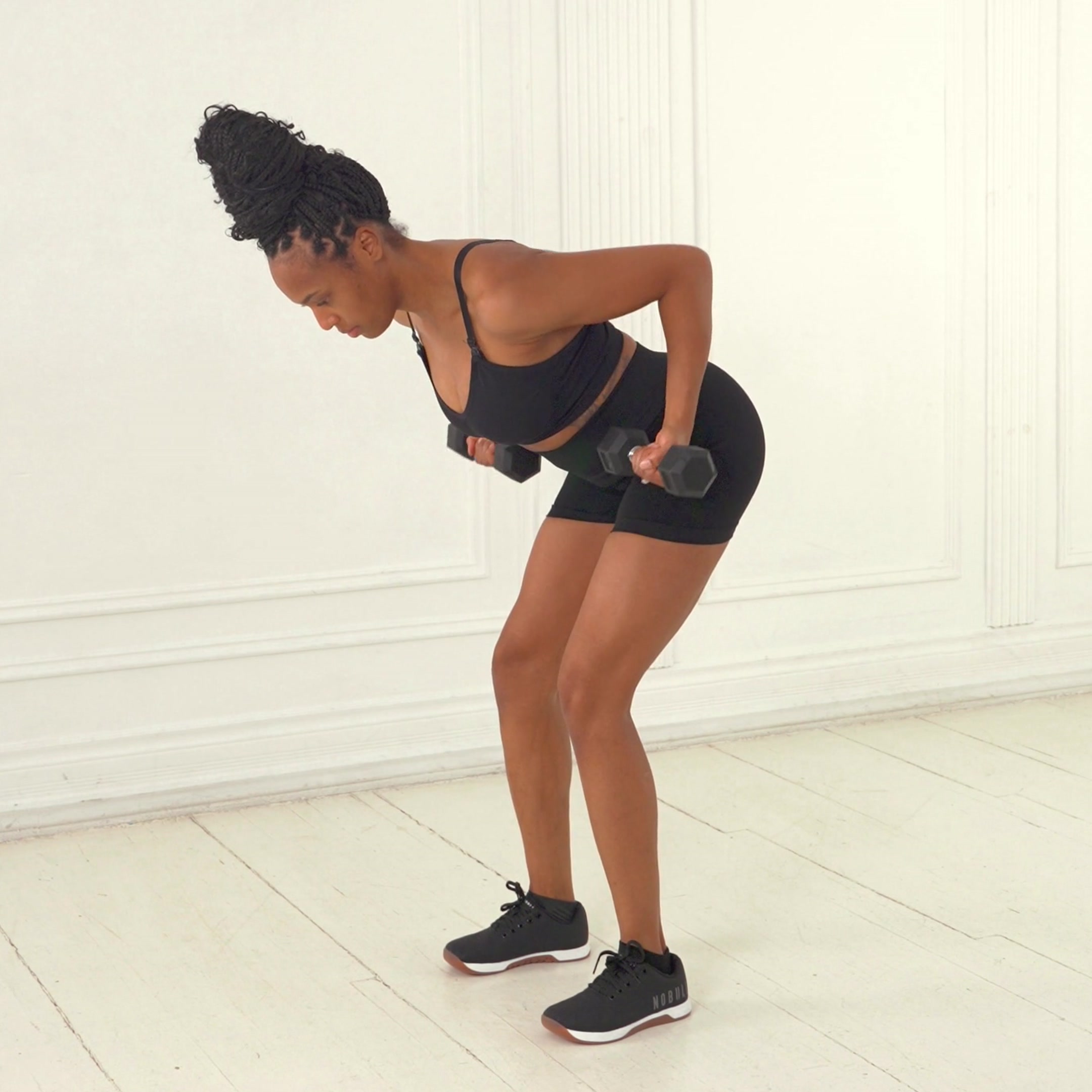 Inhale during the lowering phase and exhale as you curl the weight up, bracing your core throughout.