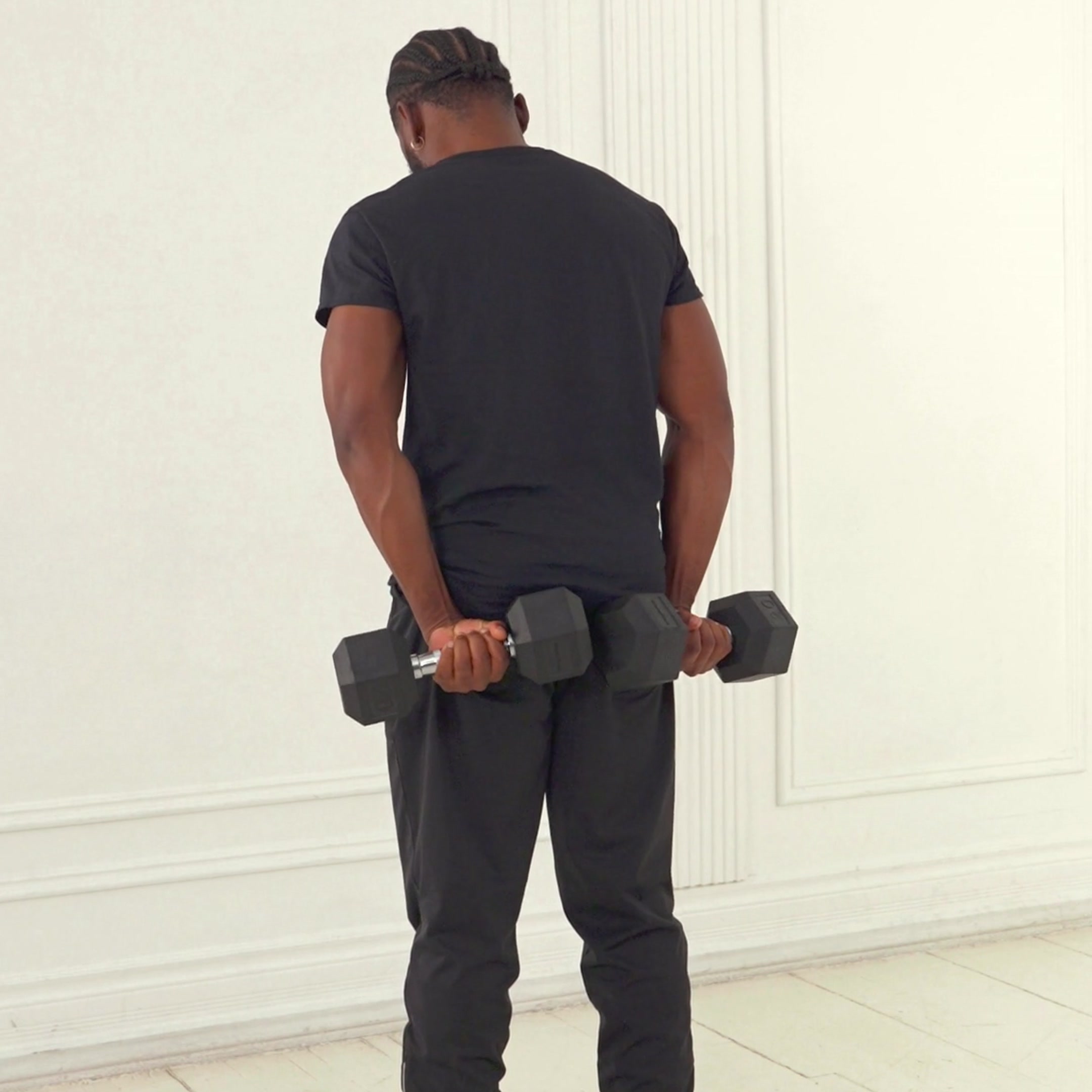 Stand with feet shoulder-width apart, holding dumbbells in each hand with overhand pronated grip, arms fully extended in front of thighs, elbows close to sides.