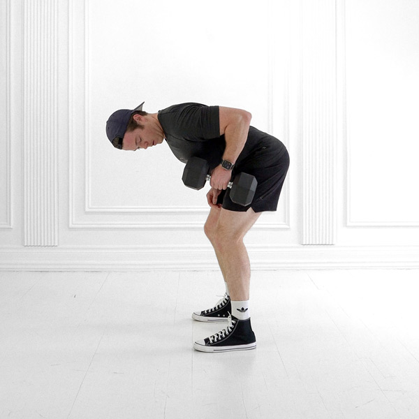 Place knee and hand of non-working side on a flat bench for support. Grasp dumbbell with working hand, arm extended down, back flat, and core engaged.