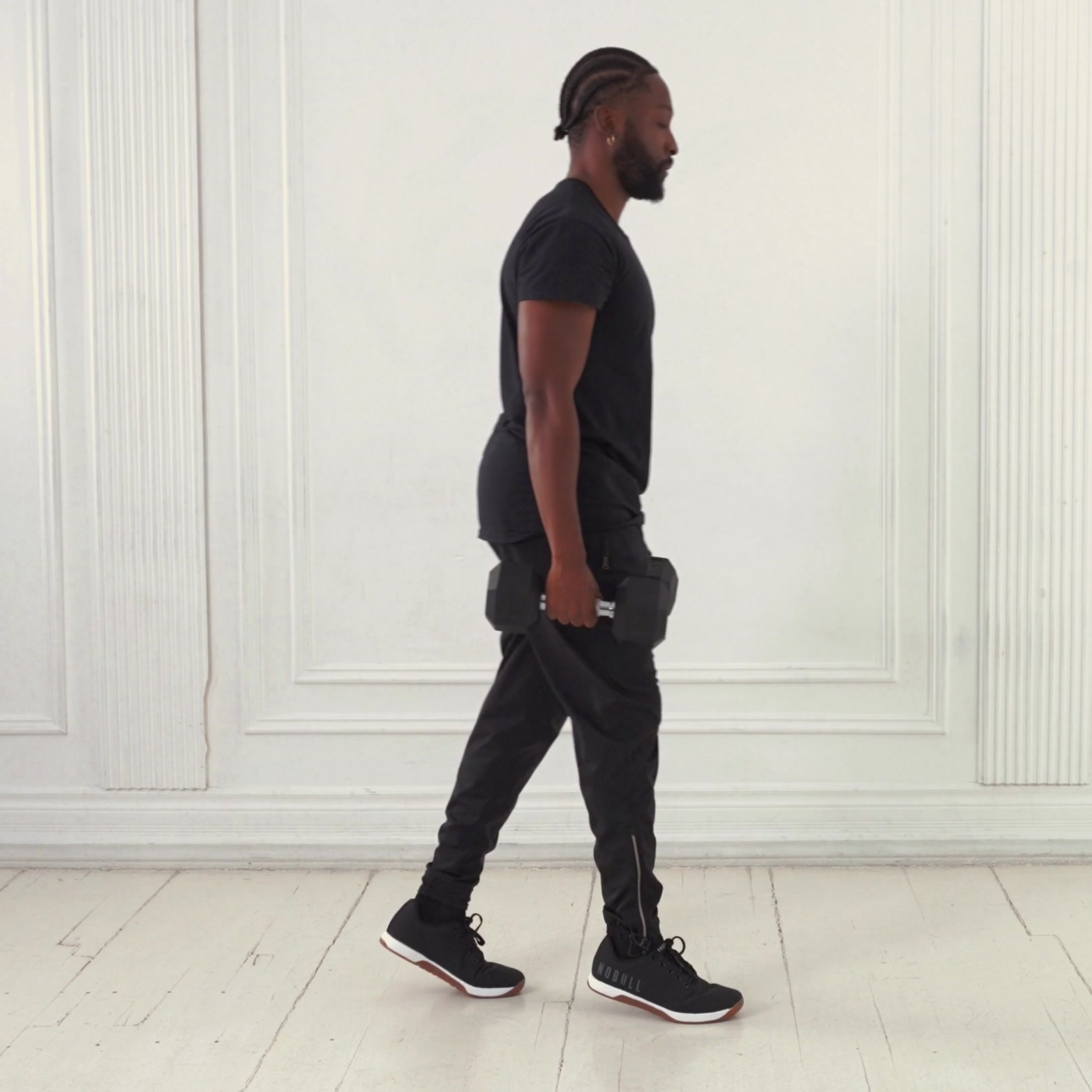 Stand on the edge of a step or block with the ball of one foot supported and heel hanging off, holding a dumbbell in the opposite hand for counterbalance, and place your free hand on a wall for stability.