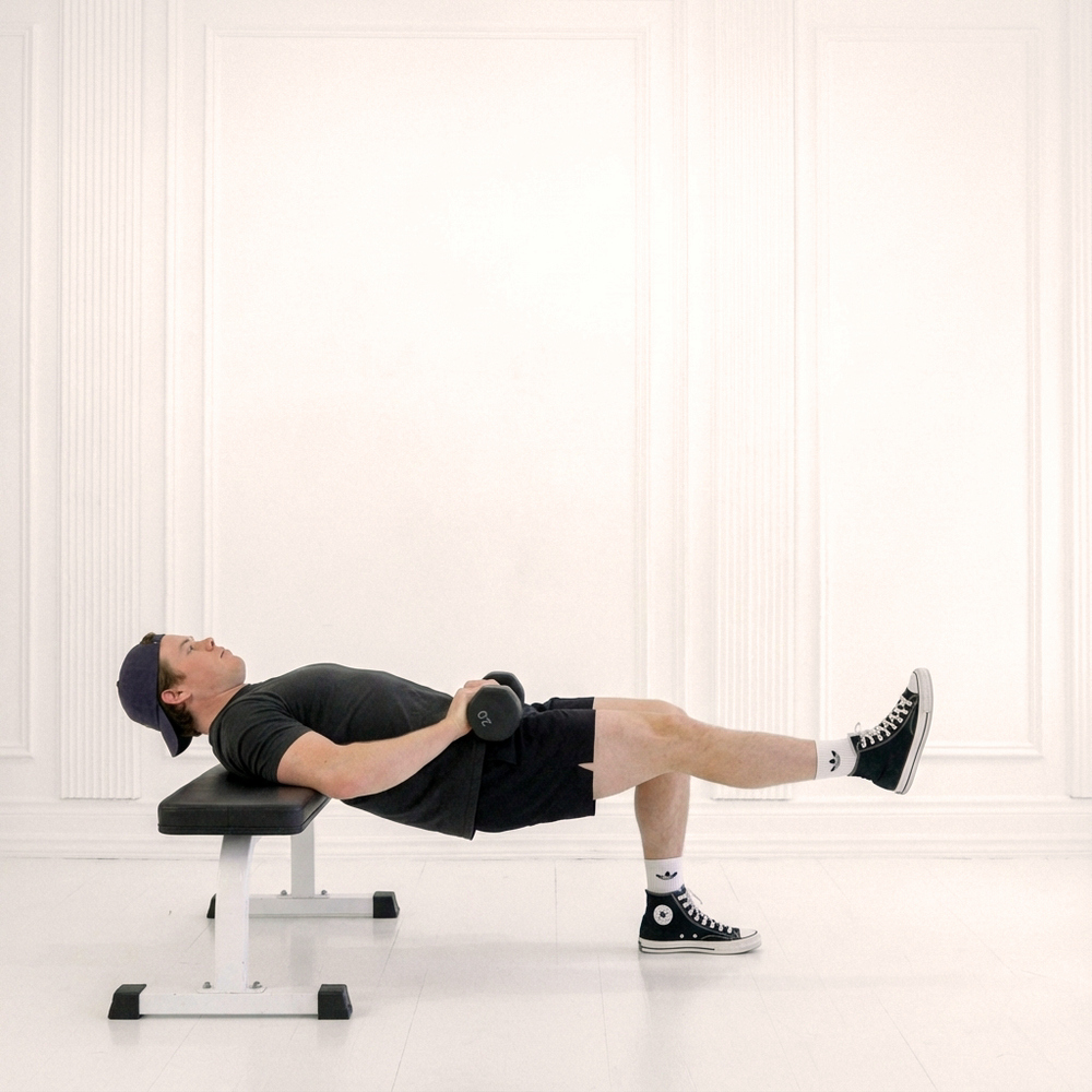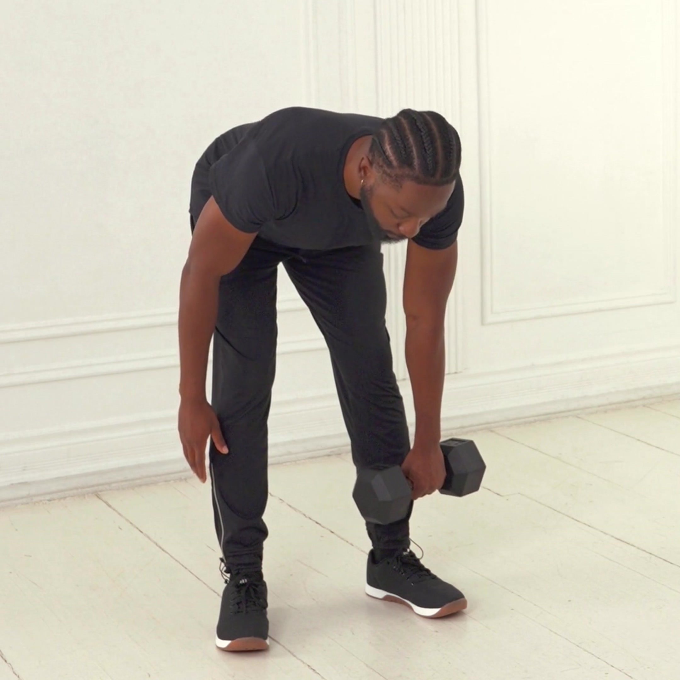 Stand on one leg holding a dumbbell in the opposite hand at your side, with a slight knee bend and the other leg lifted slightly behind you. Keep your core braced and back neutral.