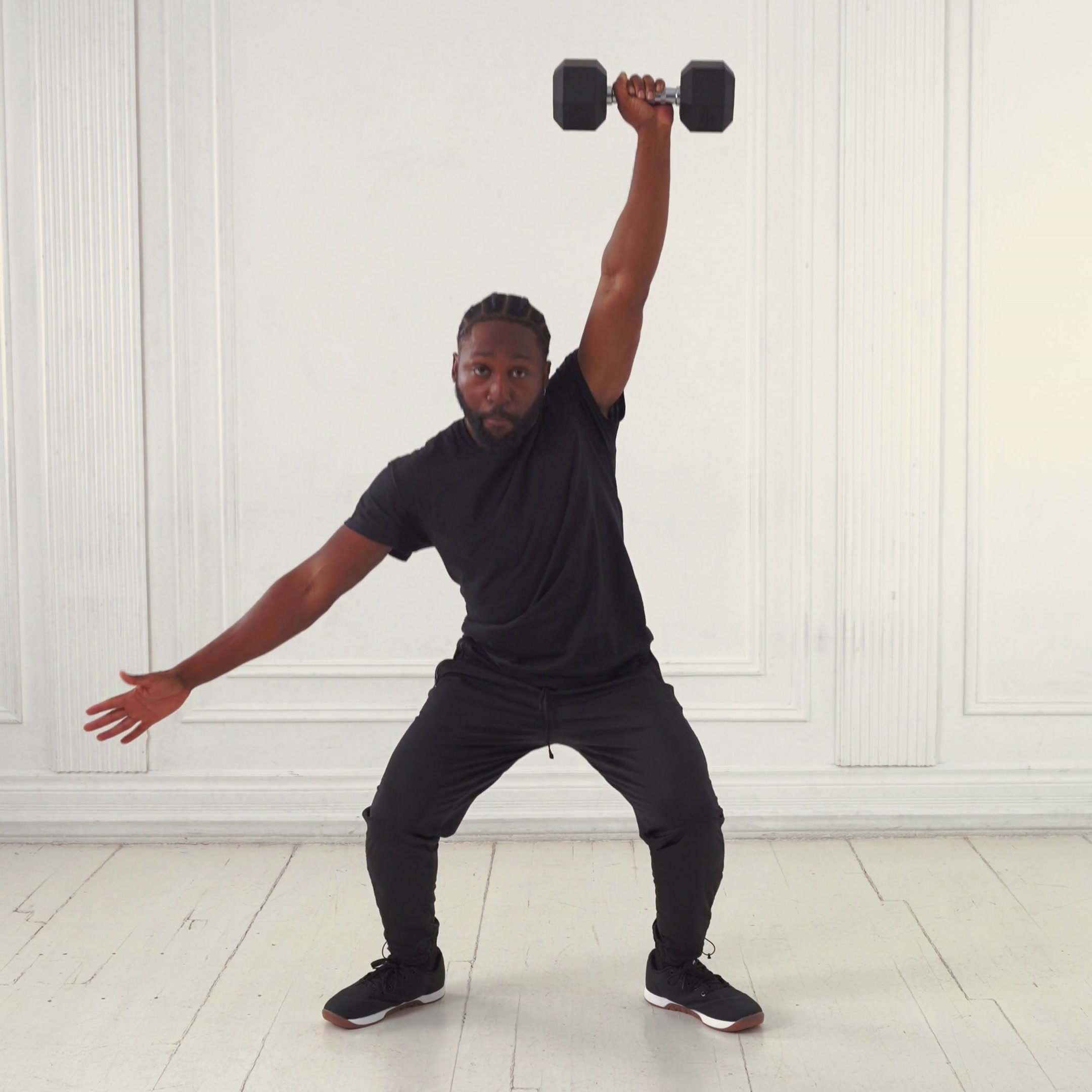Explosive full-body lift from ground to overhead with one dumbbell, targeting glutes, hamstrings, quads, and shoulders to build power, speed, and coordination; commonly used in functional training.