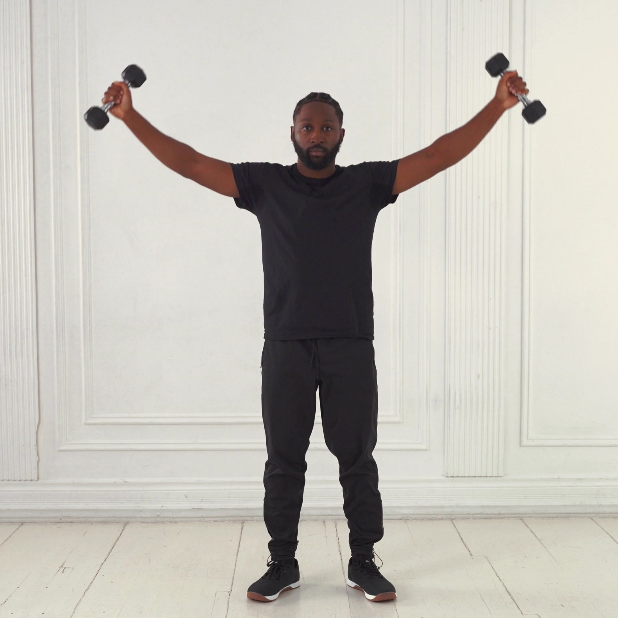 Inhale to prepare and lower, exhale to raise arms in each position while bracing core.